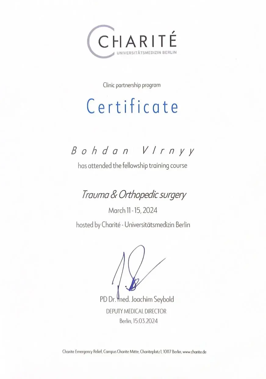 - 2024 - стажування "Травма та ортопедична хірургія", Шаріте, Берлін, 2024р.