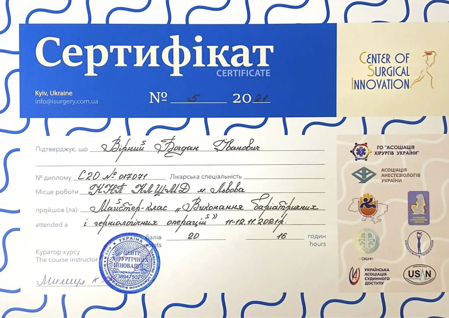 - 2021 - курс "Виконання баріатричних і герніологічних операцій", 2021р,