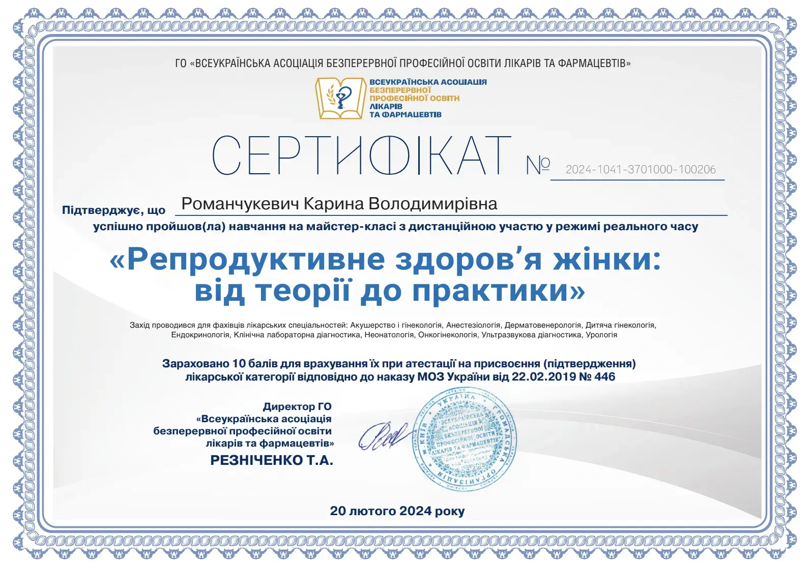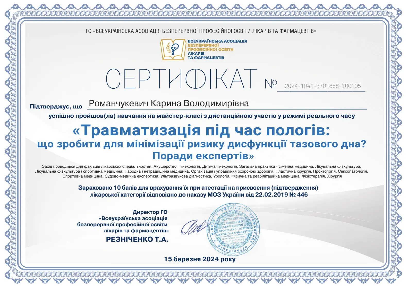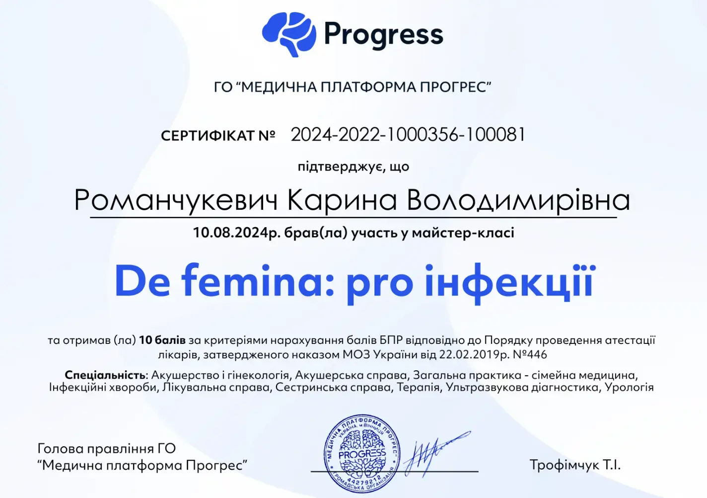 - 2022р. - сертифікат спеціаліста за спеціальністю акушерство та гінекологія,