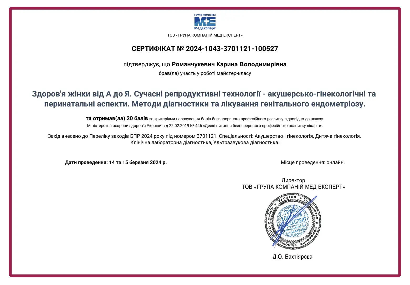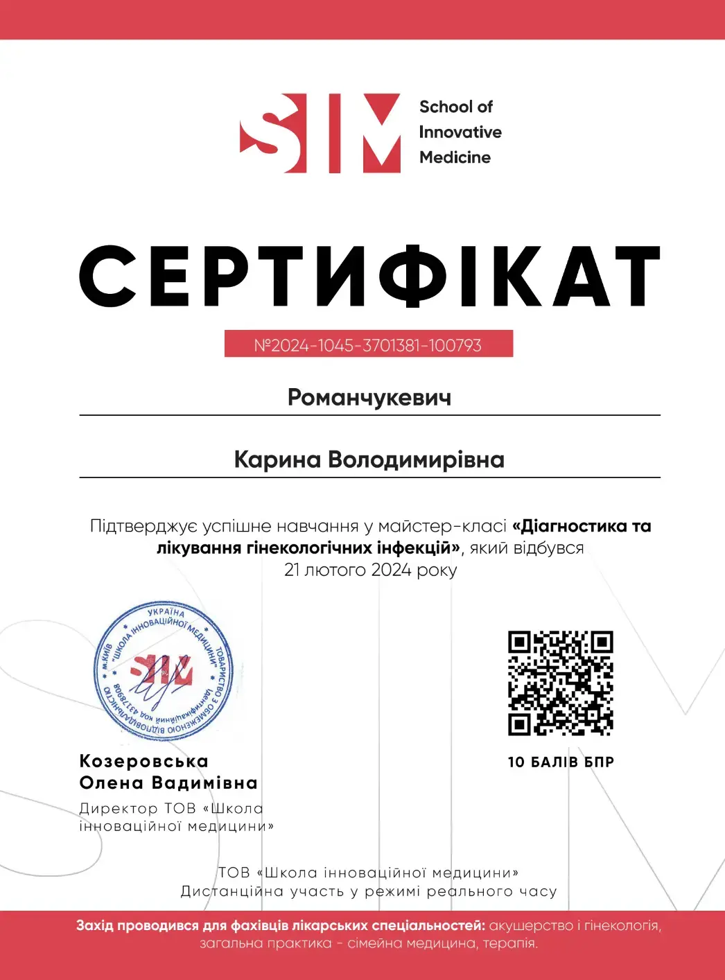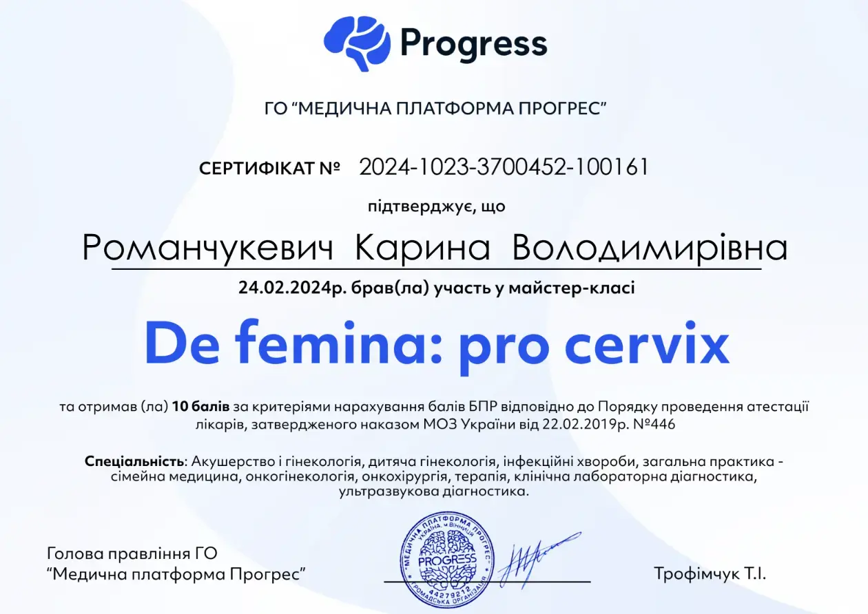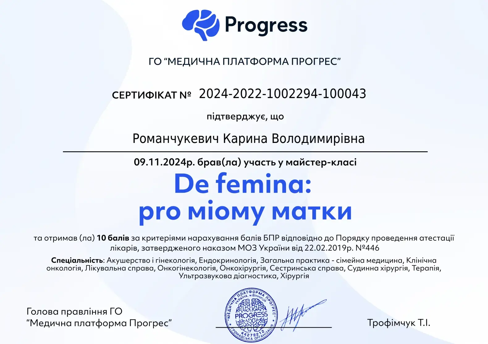 - 2022р. - сертифікат спеціаліста за спеціальністю акушерство та гінекологія,