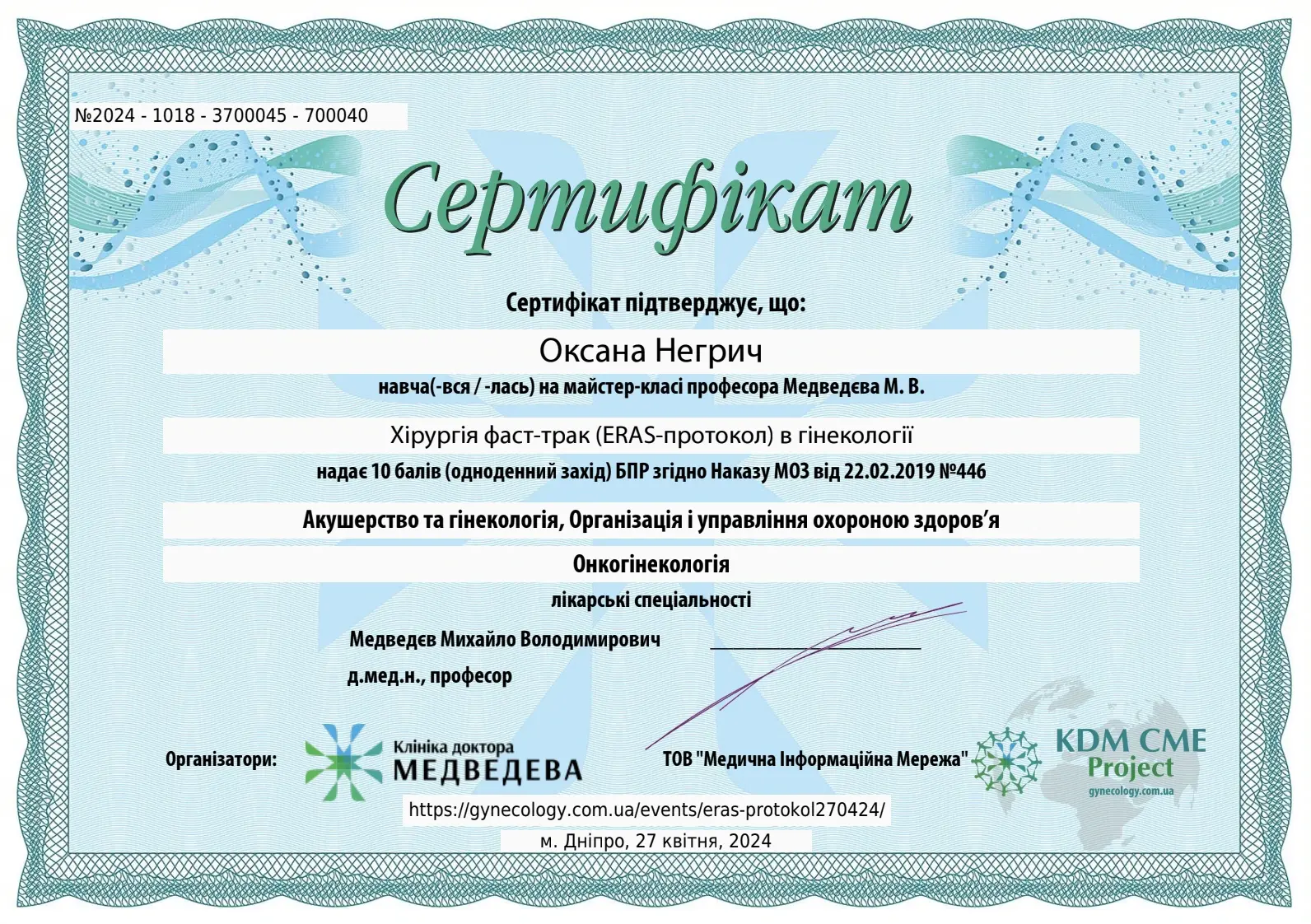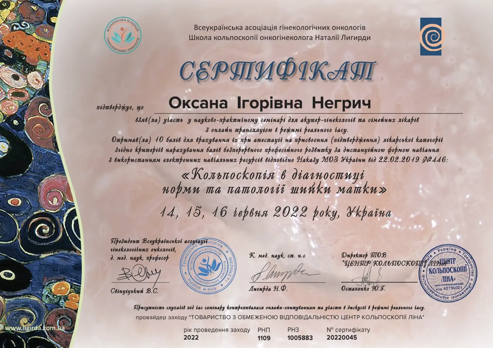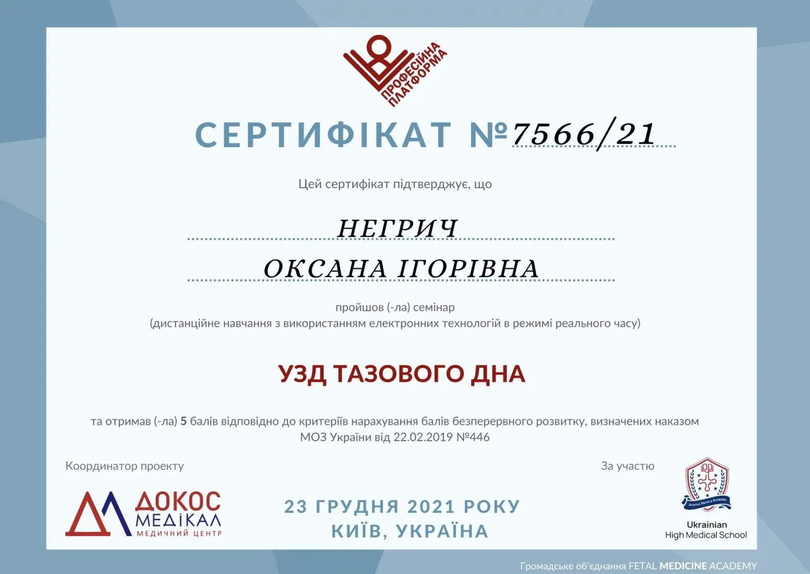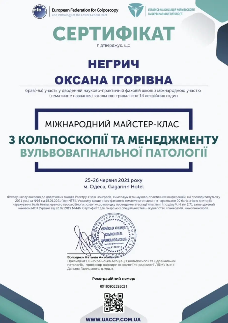- 2016 - сертифікат спеціаліста за спеціальністю акушерство та гінекологія;