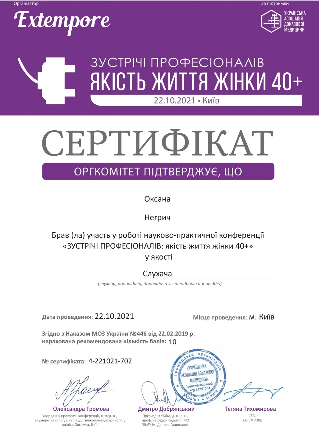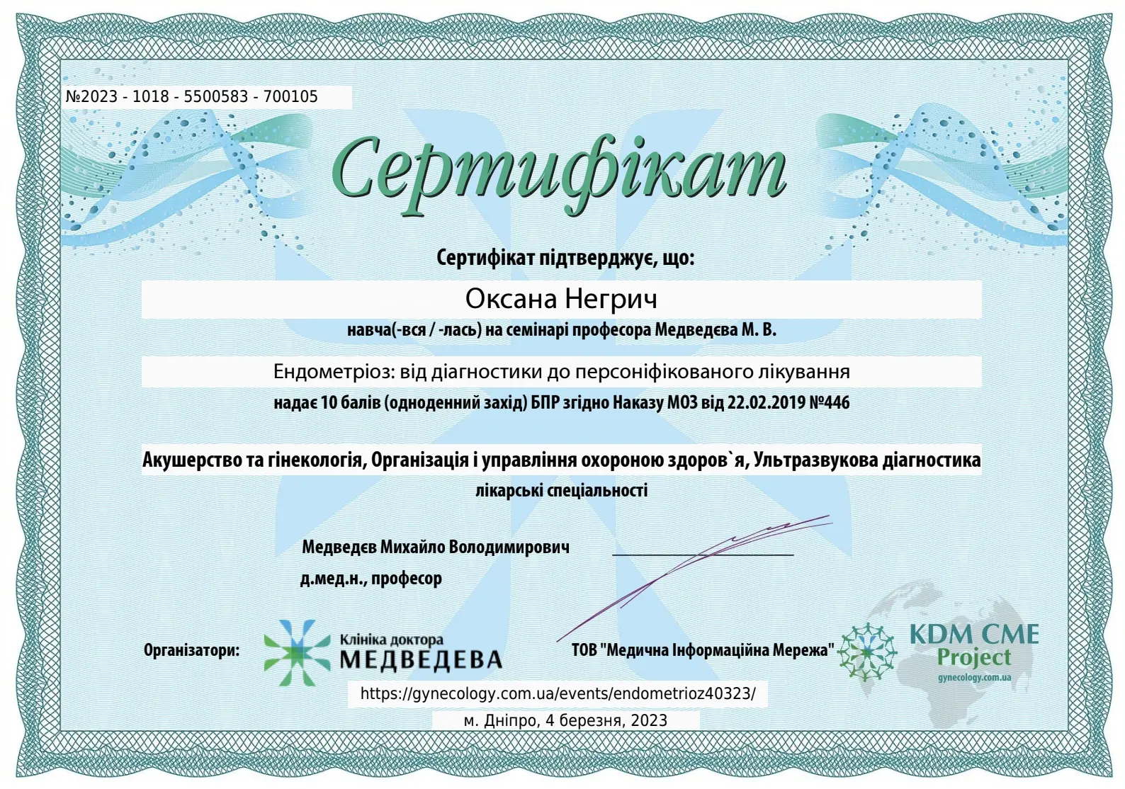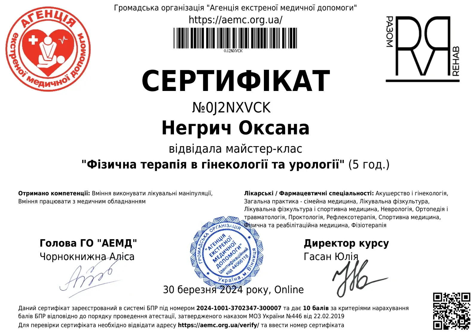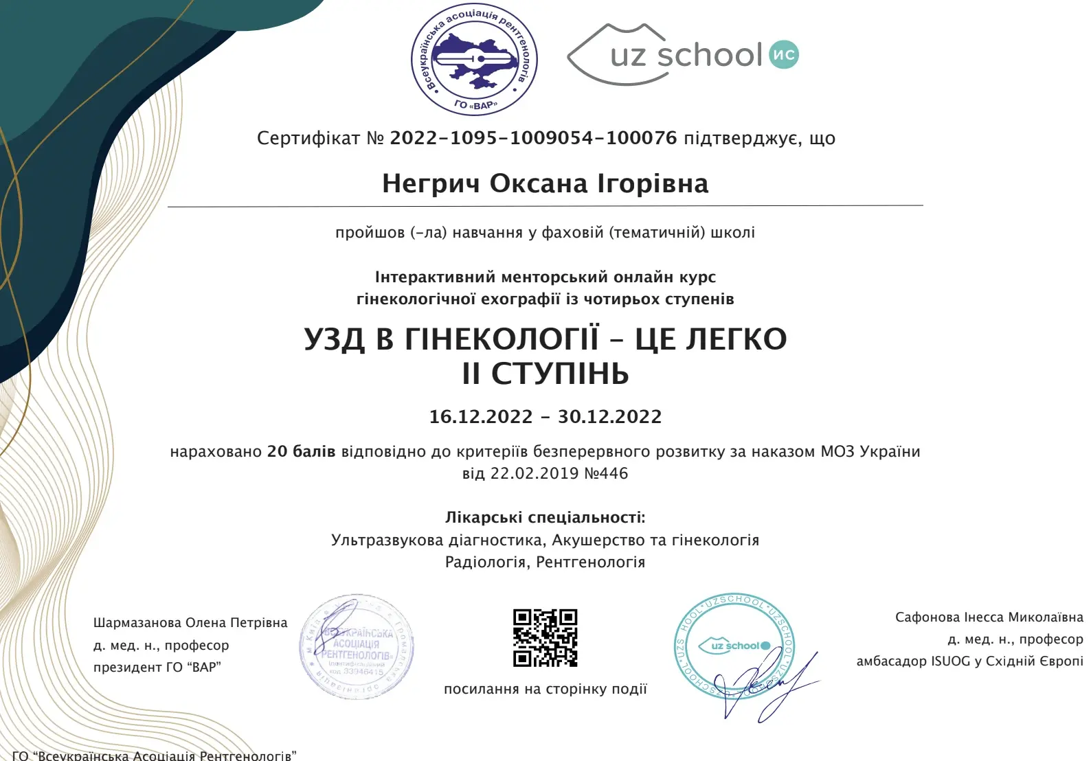 - 2016 - сертифікат спеціаліста за спеціальністю акушерство та гінекологія;