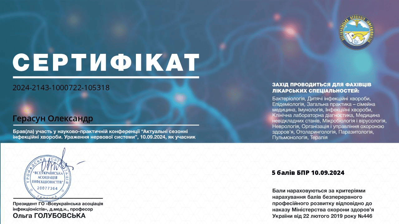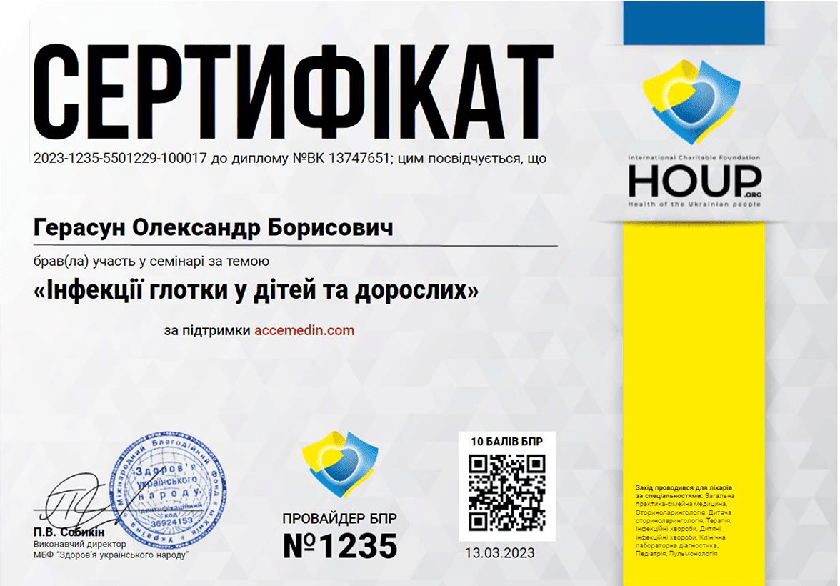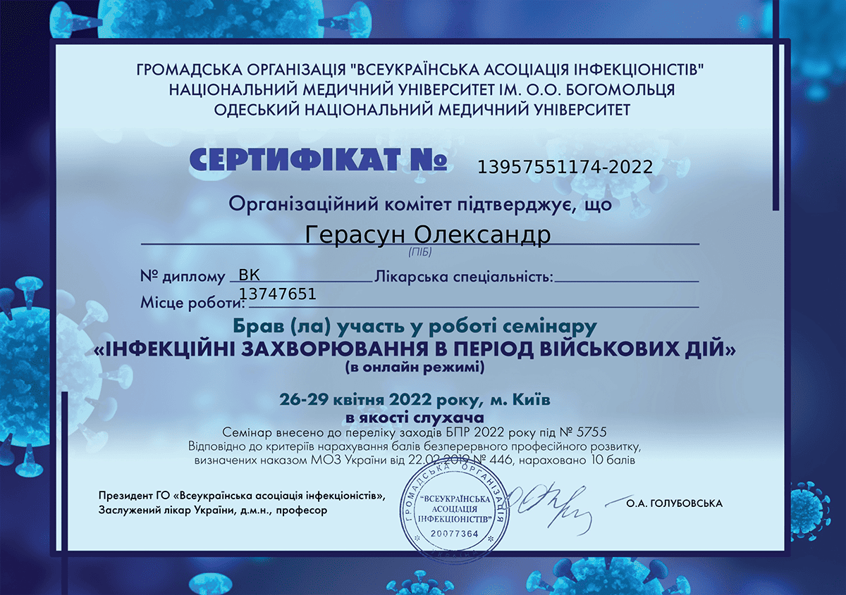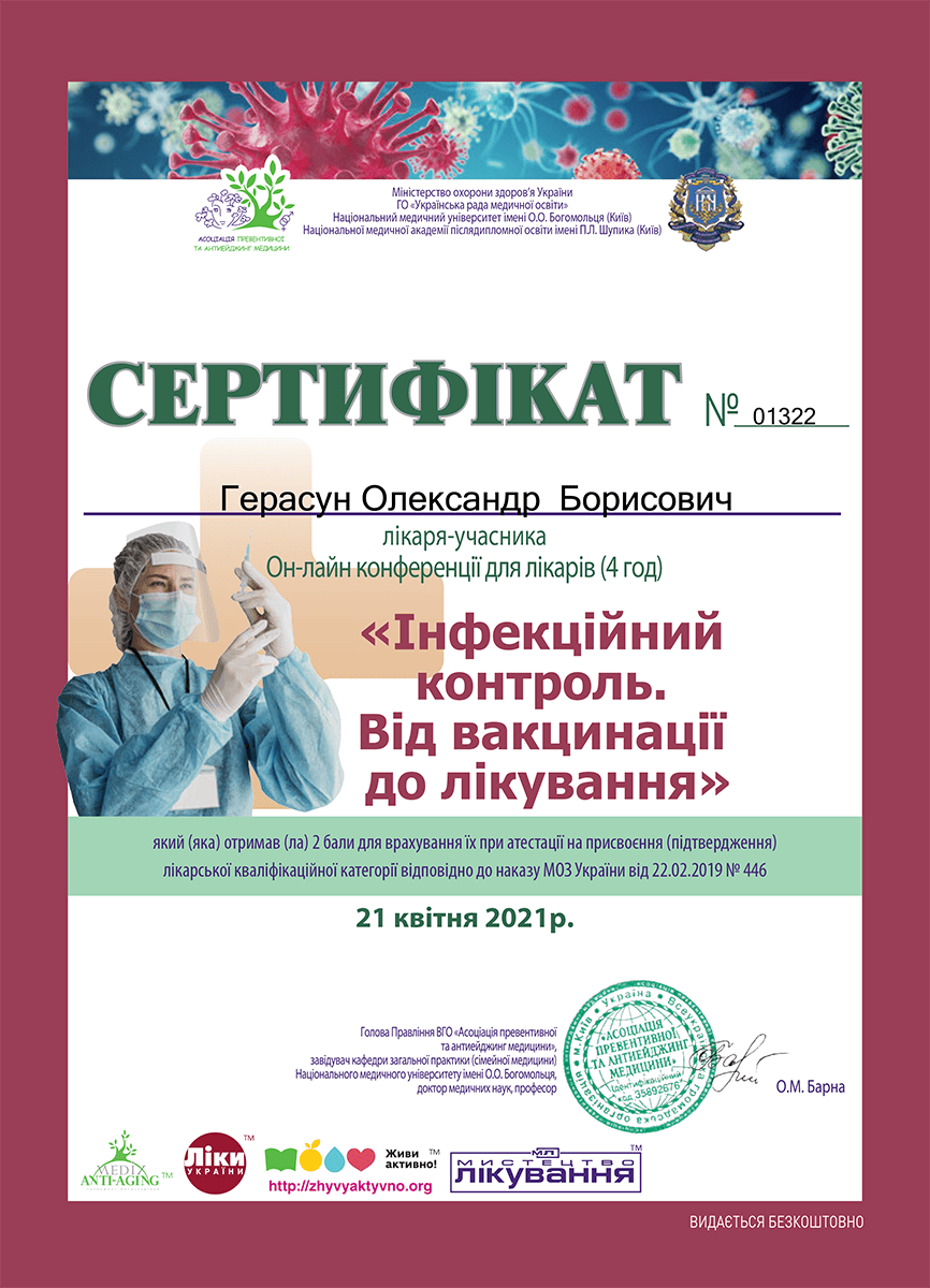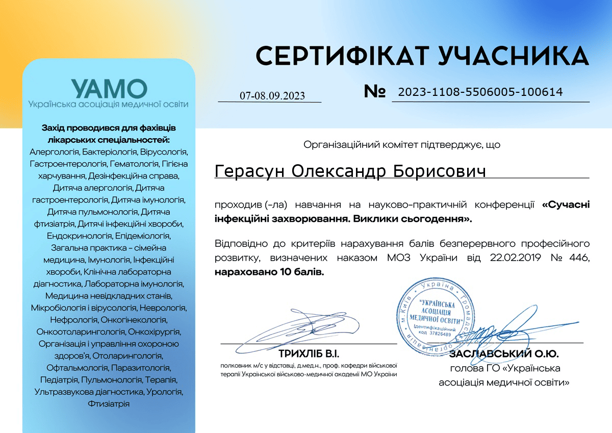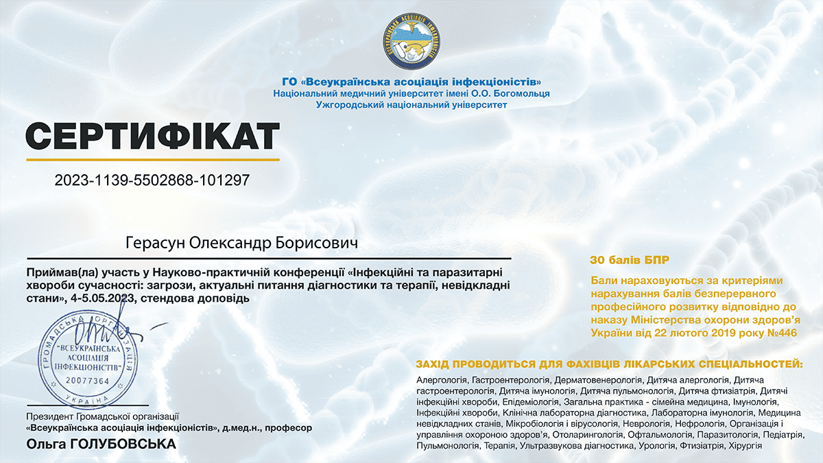 Герасун Олександр Борисович — лікар-інфекціоніст вищої кваліфікаційної категорії зі стажем понад 24 роки, кандидат медичних наук, доцент, член Всеукраїнської асоціації інфекціоністів та Американського товариства мікробіології. Як доцент кафедри інфекційних хвороб проводить практичні заняття та читає лекції для студентів ЛНМУ імені Данила Галицького та лікарів факультету післядипломної освіти. Лікар постійно завершує кваліфікацію, зокрема нещодавно завершив курс з педагогічних, психологічних та правових аспектів вищої медичної освіти.