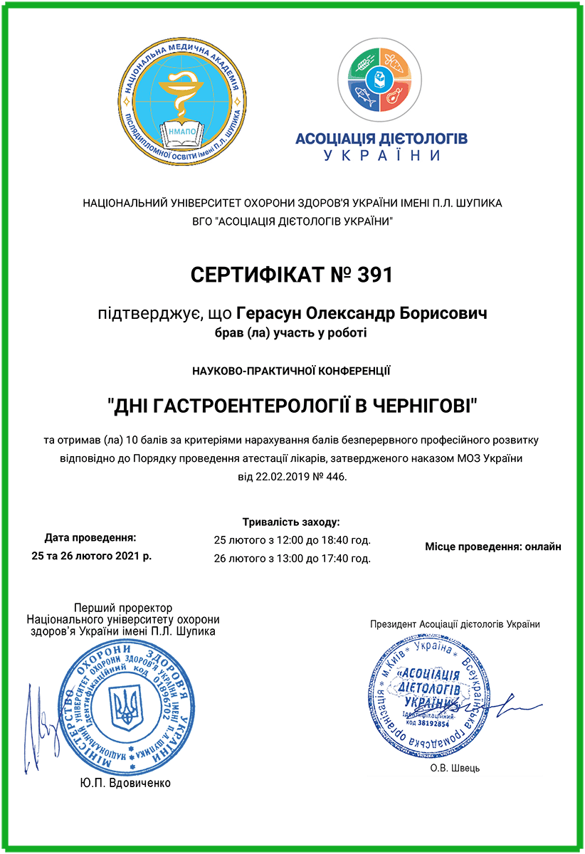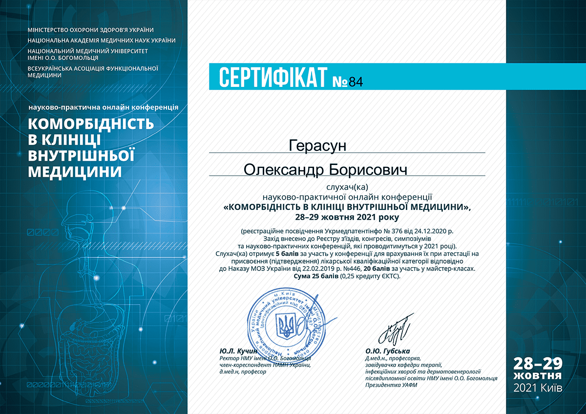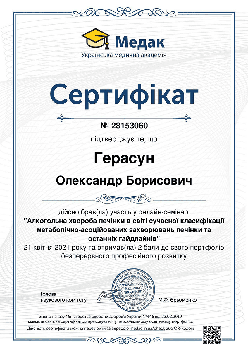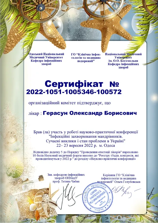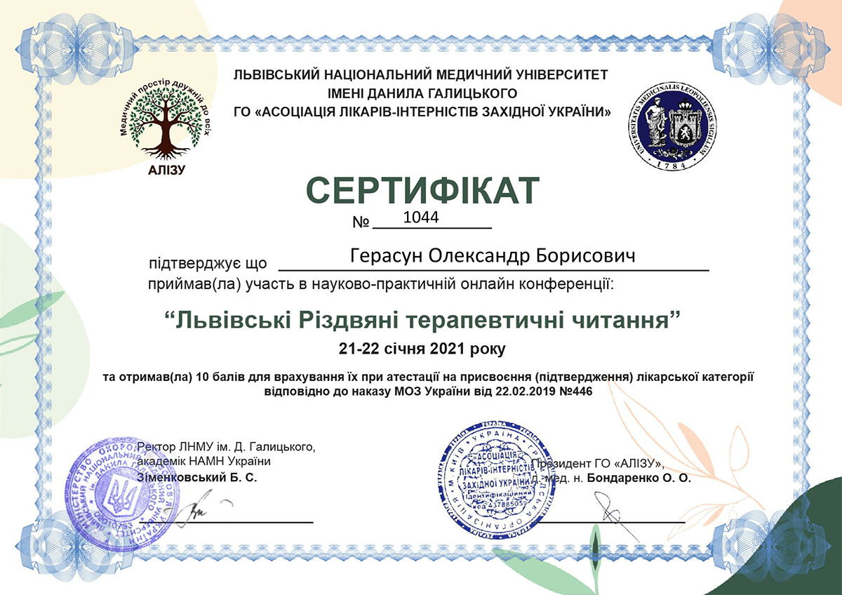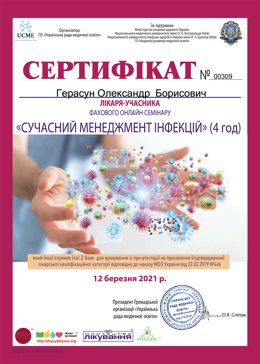 Герасун Олександр Борисович — лікар-інфекціоніст вищої кваліфікаційної категорії зі стажем понад 24 роки, кандидат медичних наук, доцент, член Всеукраїнської асоціації інфекціоністів та Американського товариства мікробіології. Як доцент кафедри інфекційних хвороб проводить практичні заняття та читає лекції для студентів ЛНМУ імені Данила Галицького та лікарів факультету післядипломної освіти. Лікар постійно завершує кваліфікацію, зокрема нещодавно завершив курс з педагогічних, психологічних та правових аспектів вищої медичної освіти.