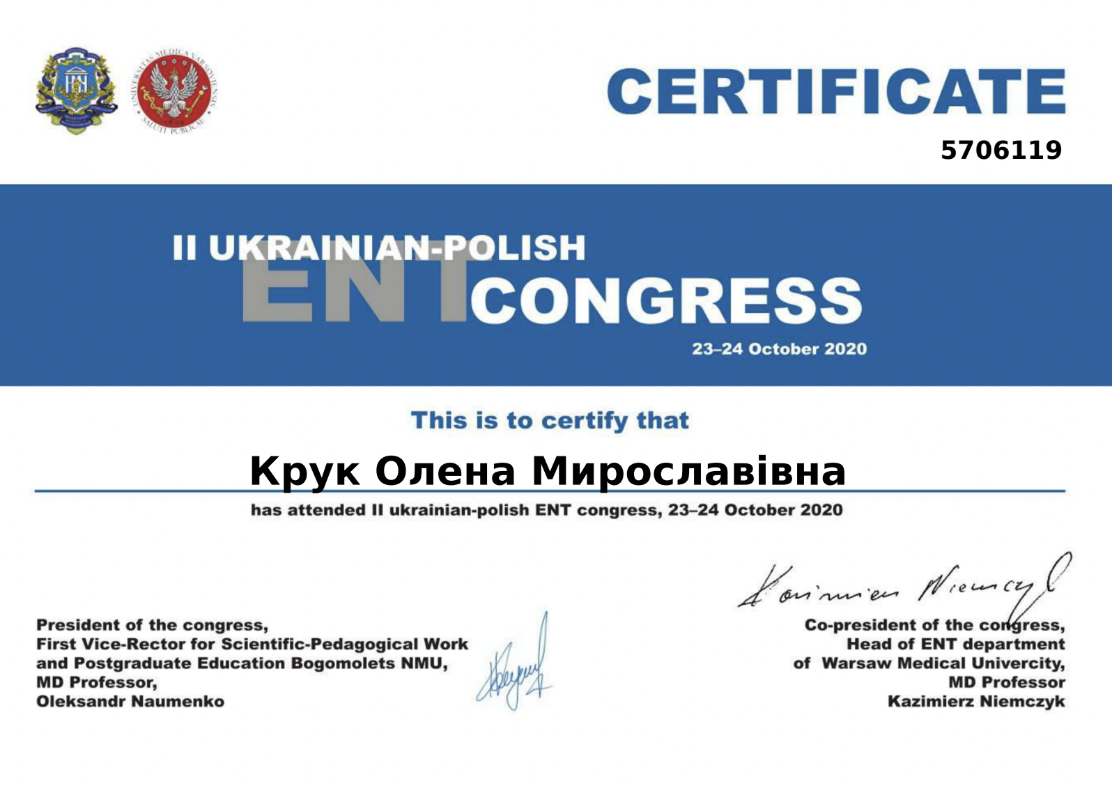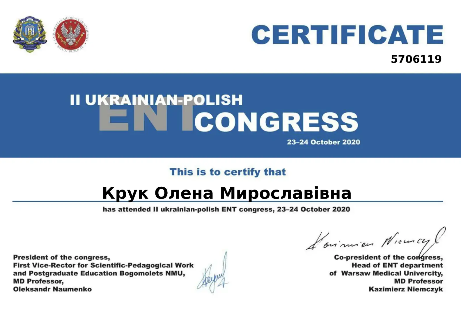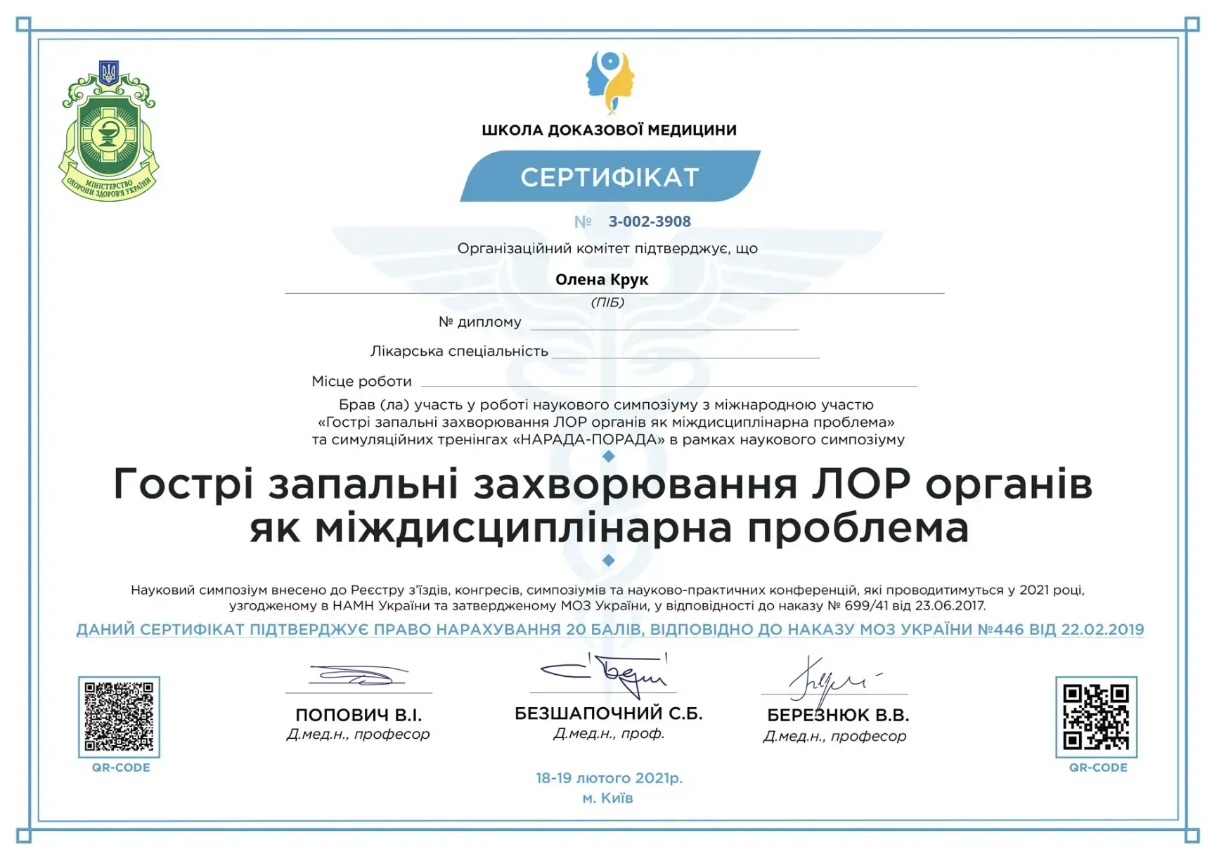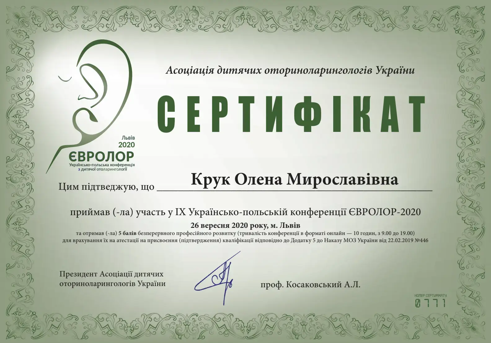 - 2020р - спеціалізація "Отоларингологія" на базі ЛНМУ ім. Данила Галицького, ЛОКЛ
