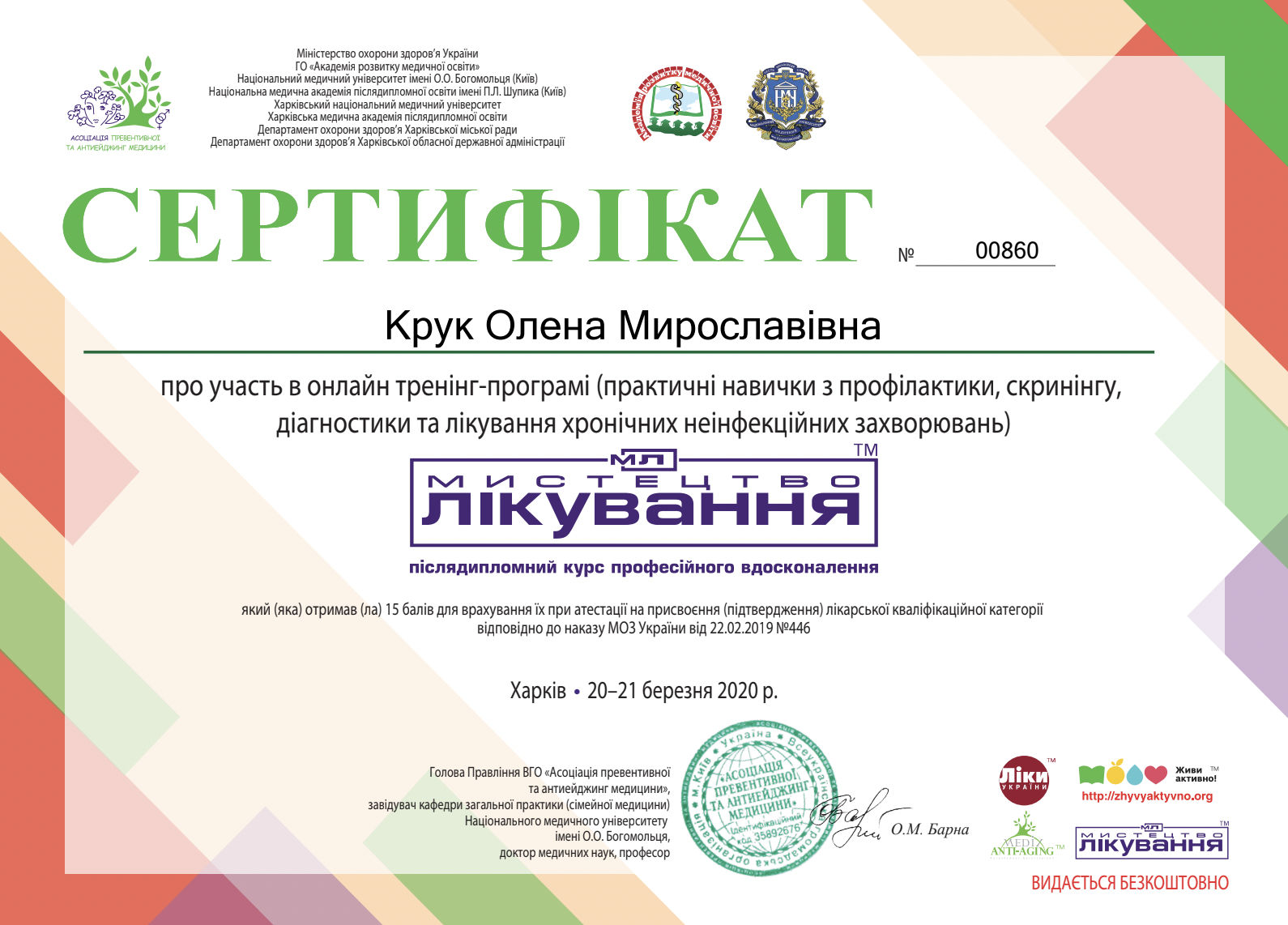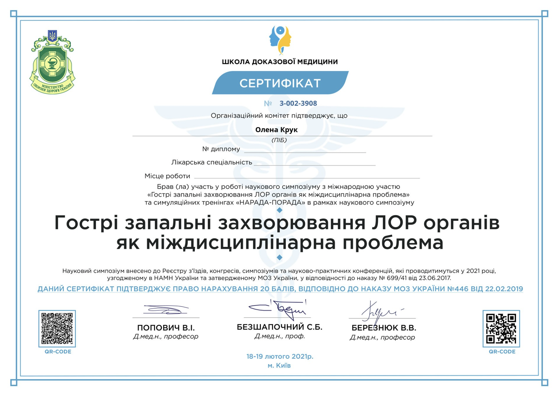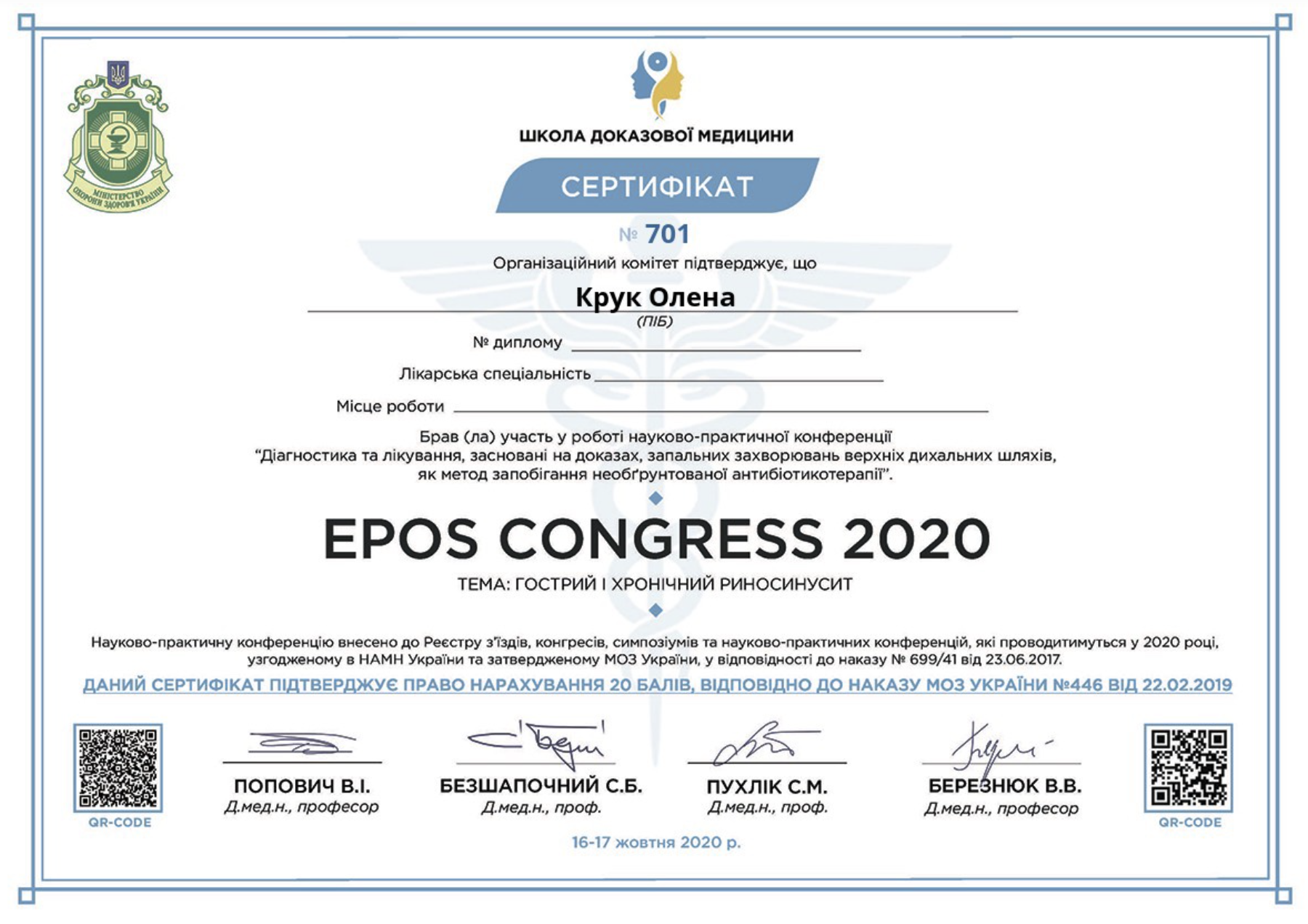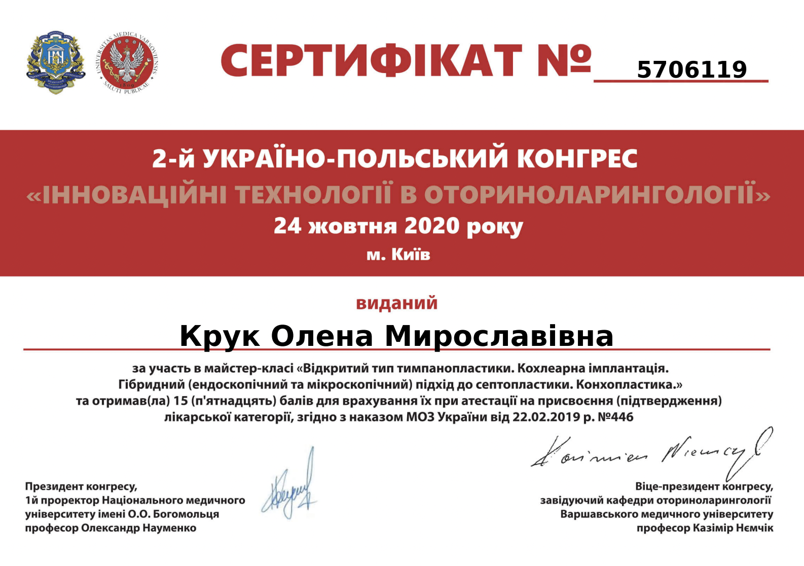 - 2020р - спеціалізація "Отоларингологія" на базі ЛНМУ ім. Данила Галицького, ЛОКЛ