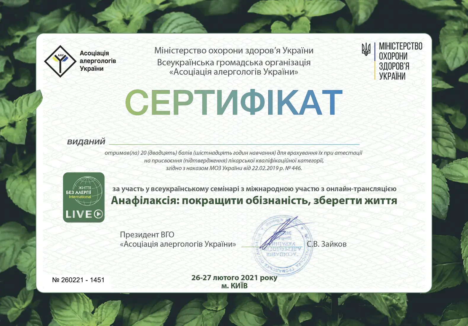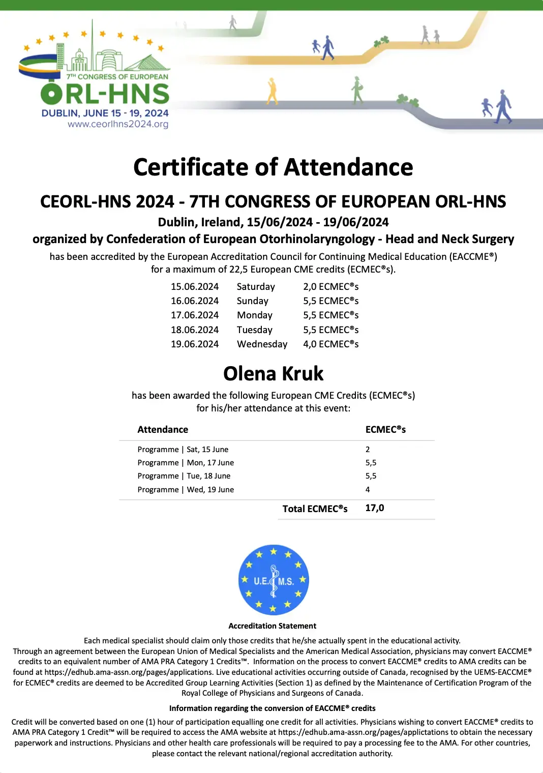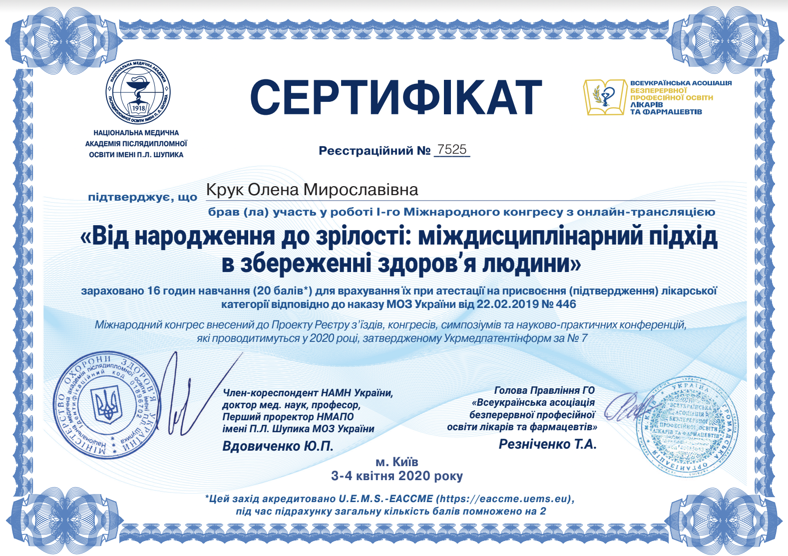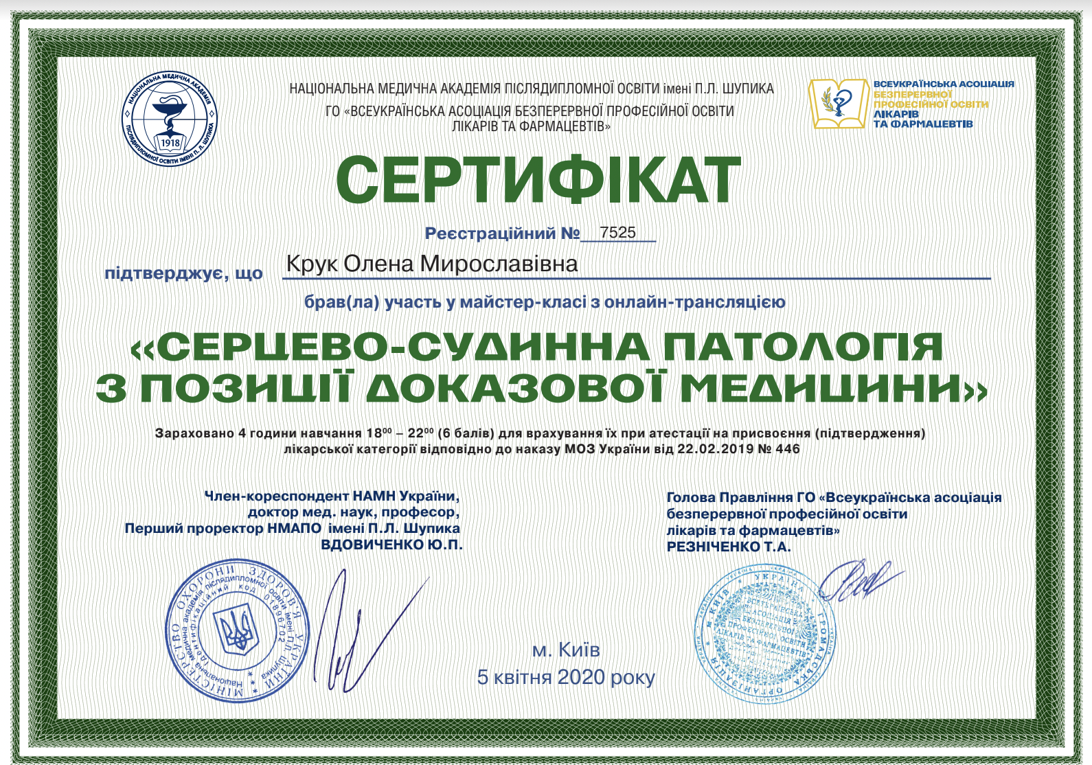 - 2020р - спеціалізація "Отоларингологія" на базі ЛНМУ ім. Данила Галицького, ЛОКЛ