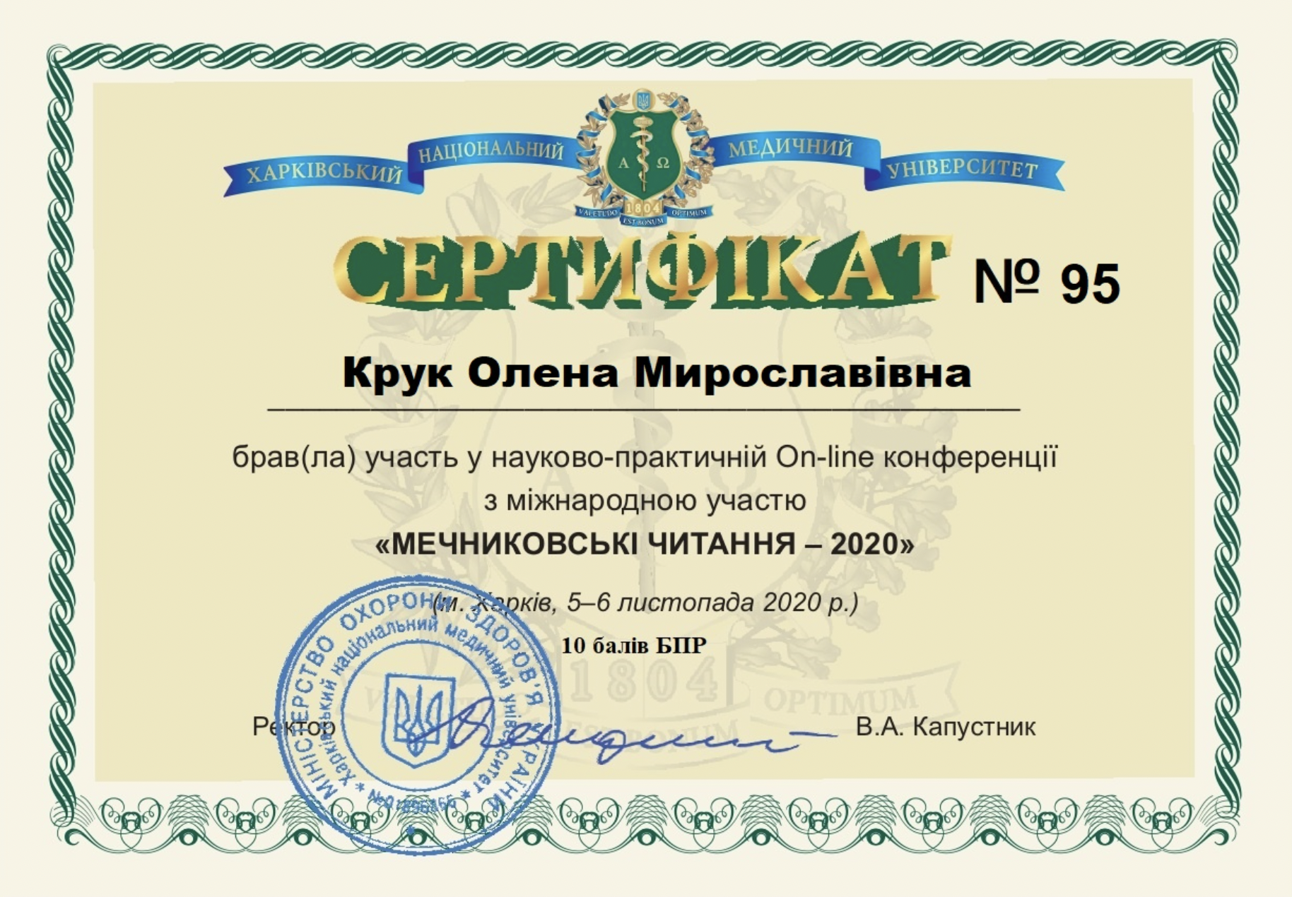 - 2020 - Науково-практична онлайн-конференція з міжнародною участю: «Мечніковські читання 2020» стендова доповідь (Харків, 2020).