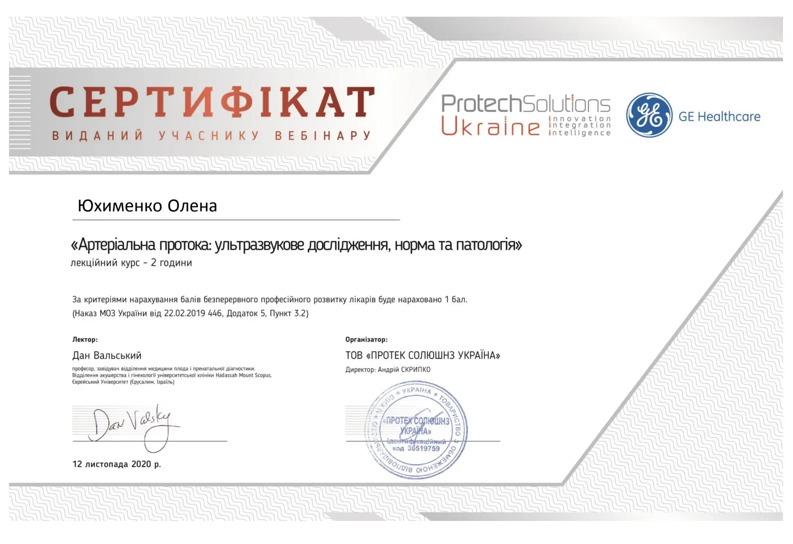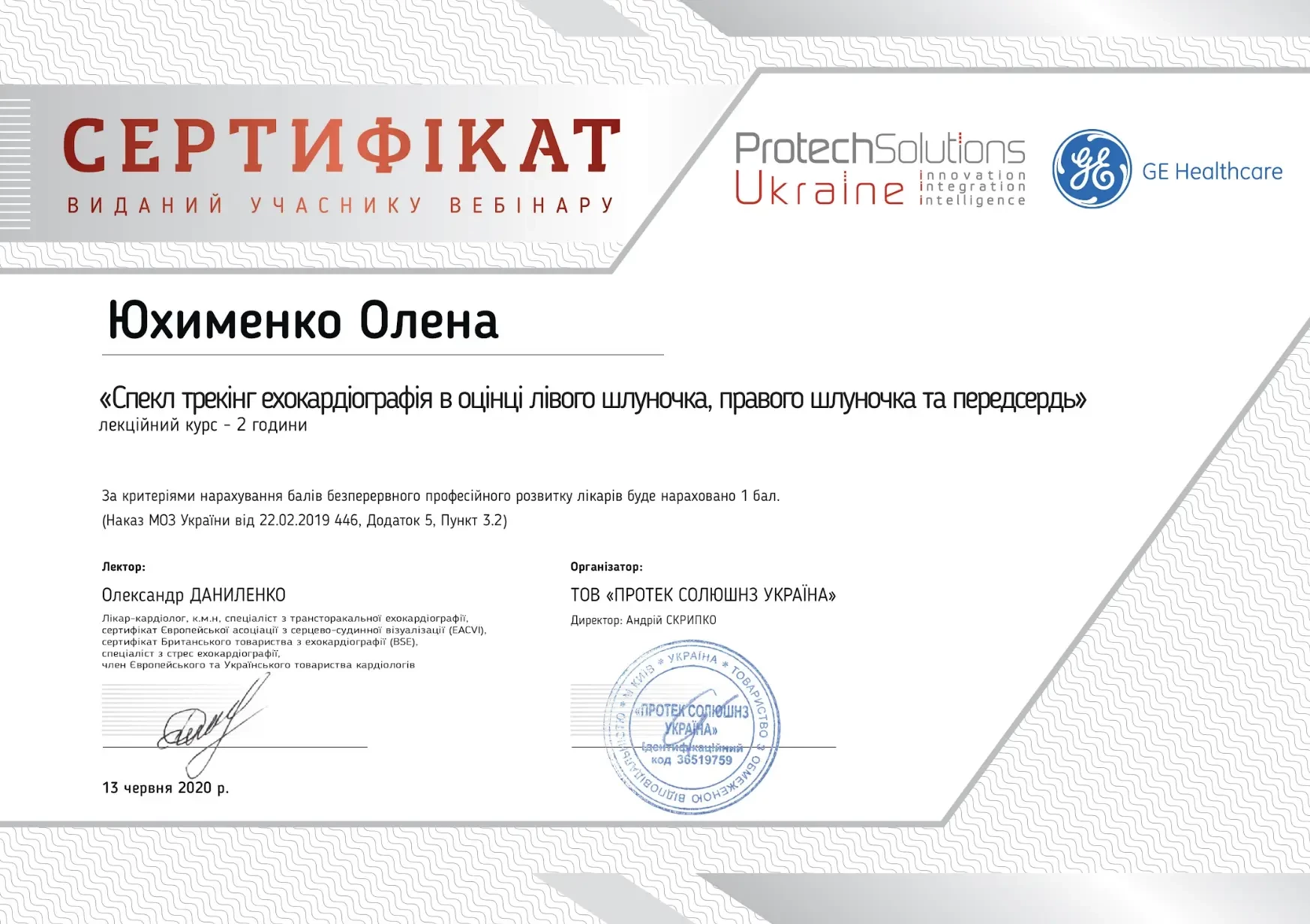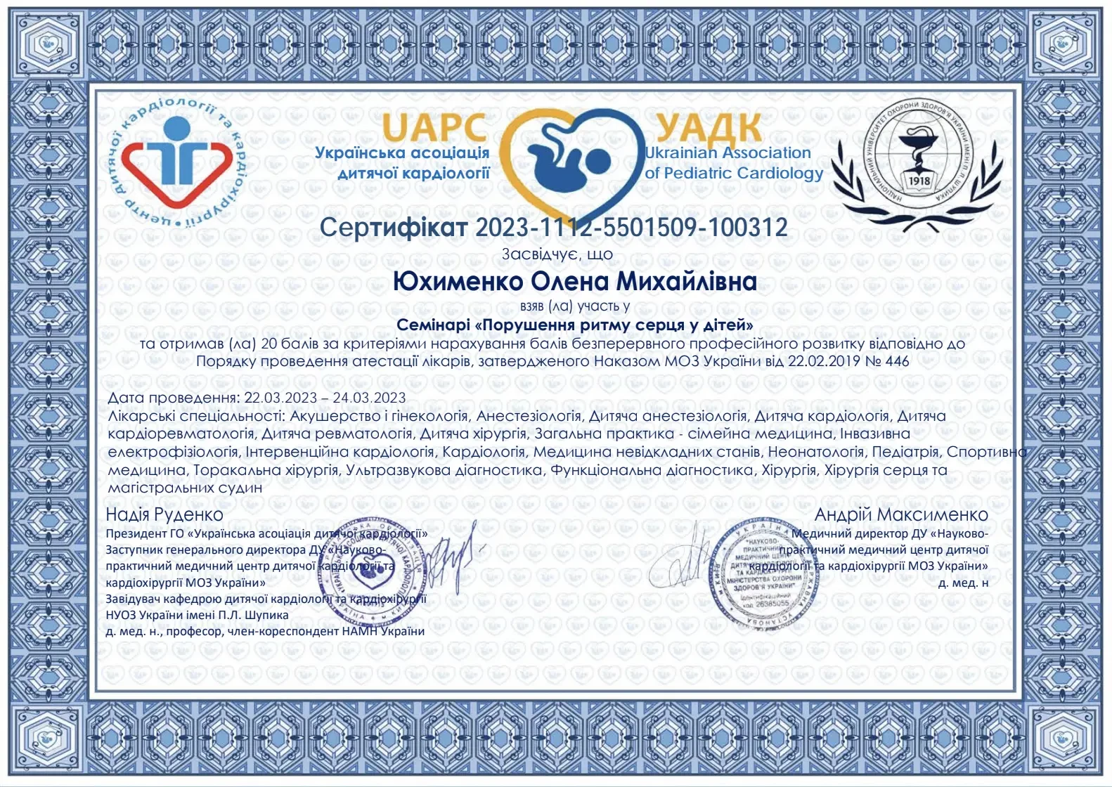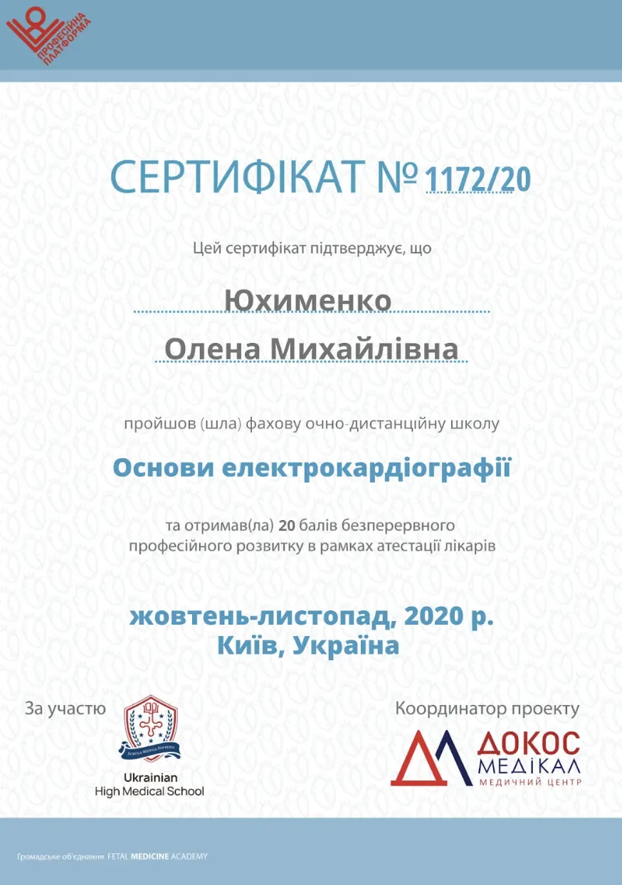 - 2019 р. - спеціалізація лікаря з функціональної діагностики (Кафедра терапії, кардіології та сімейної медицини ДМА),