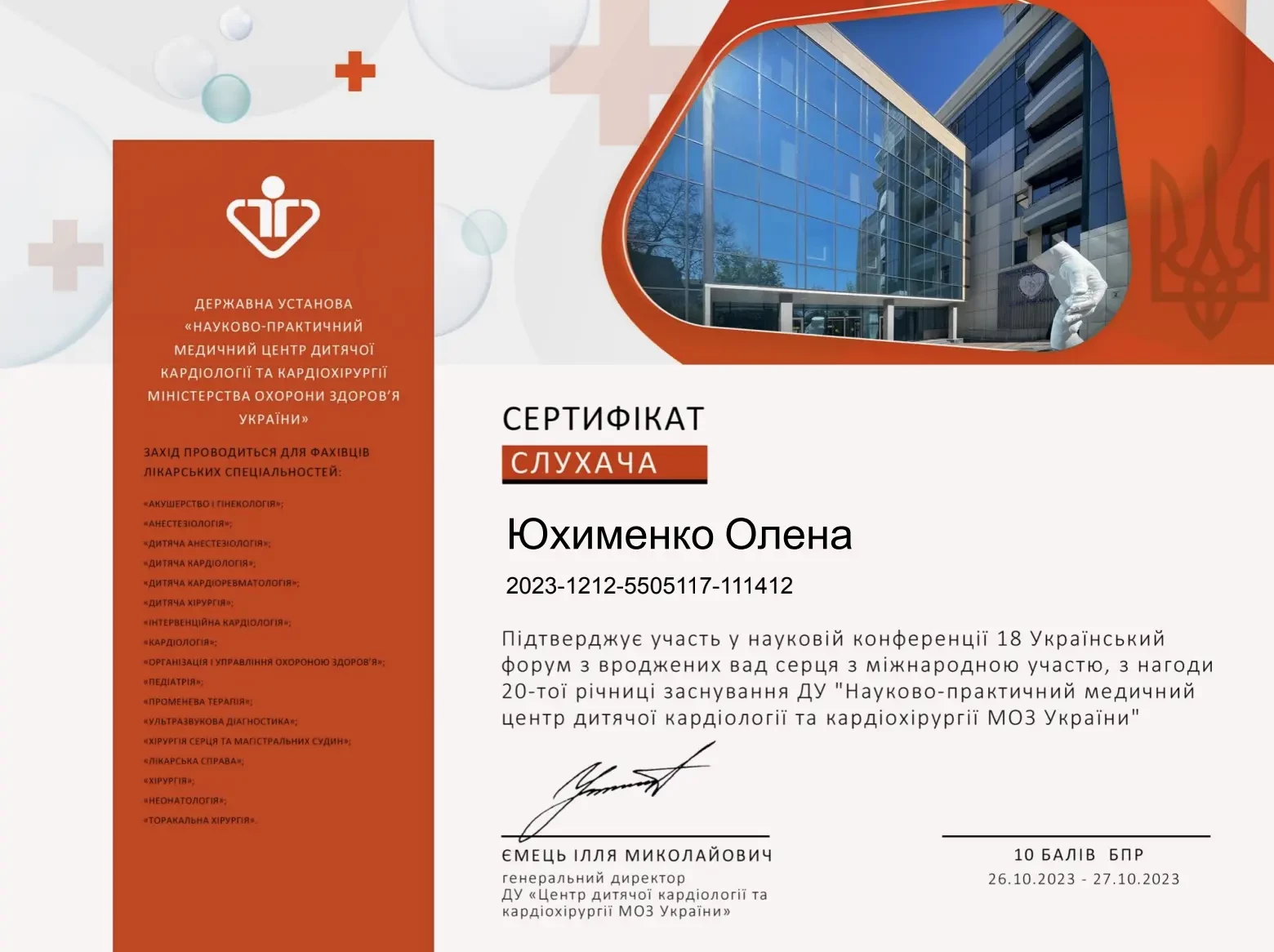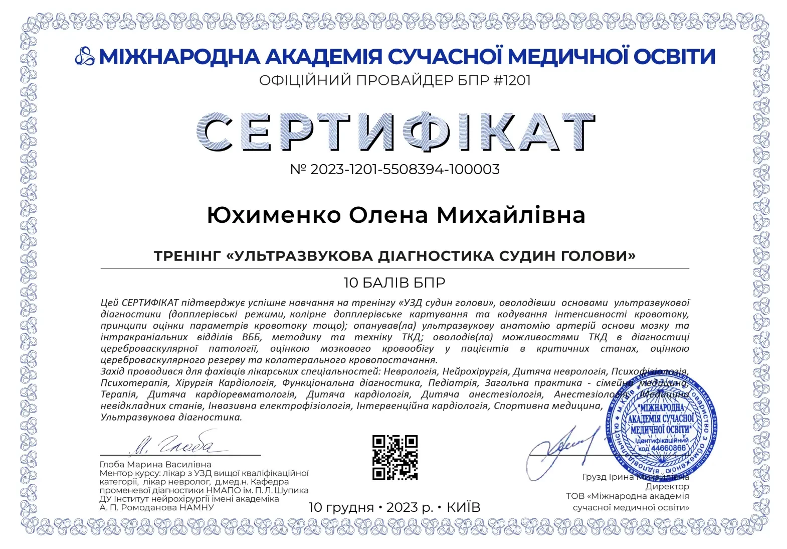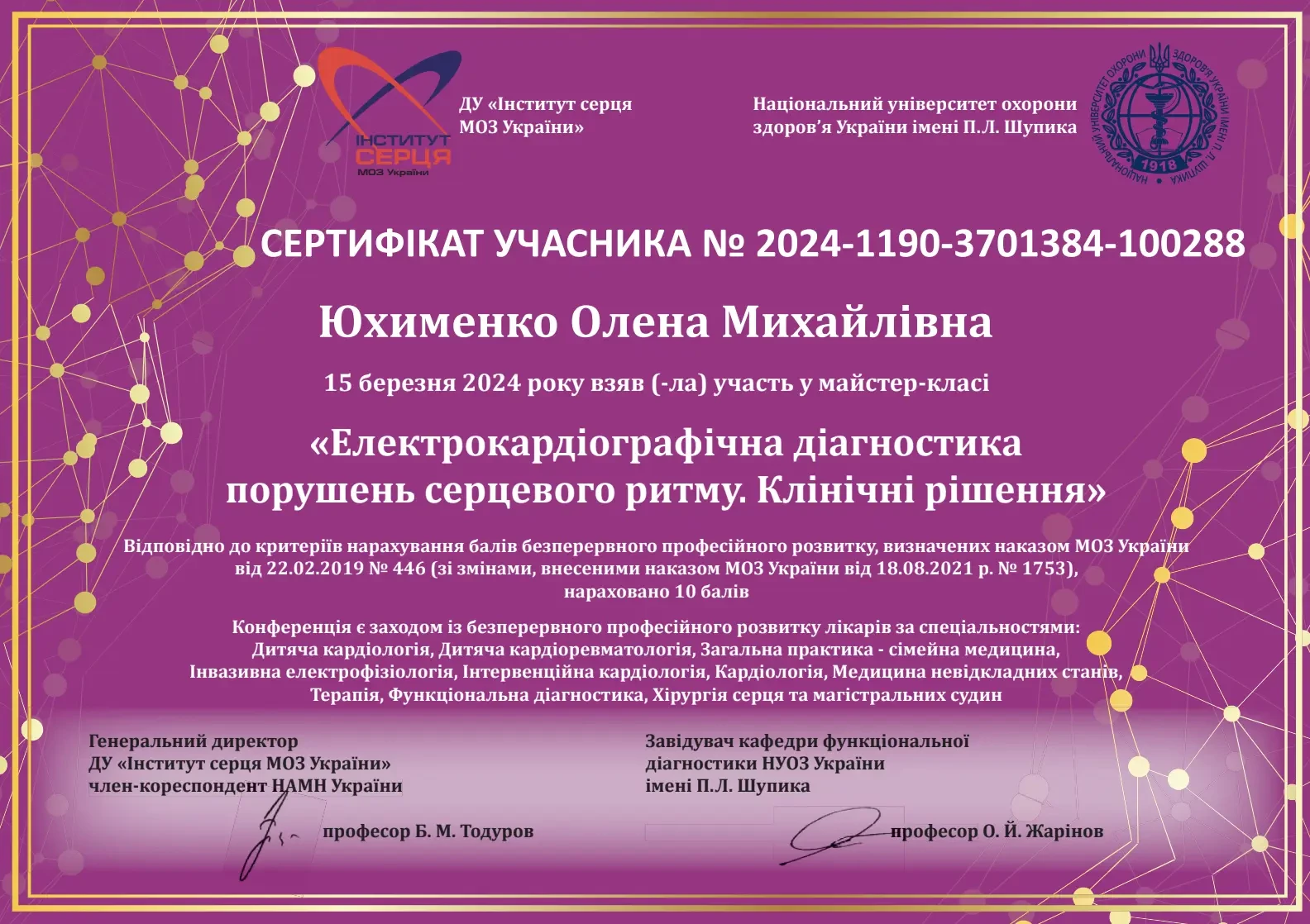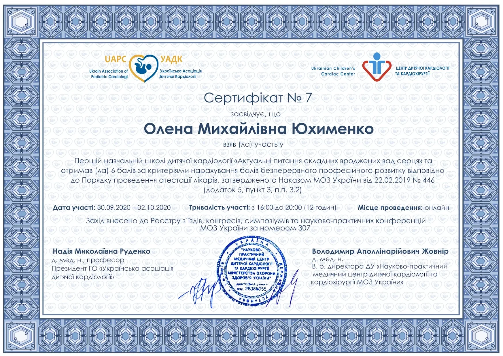 - 2019 р. - спеціалізація лікаря з функціональної діагностики (Кафедра терапії, кардіології та сімейної медицини ДМА),