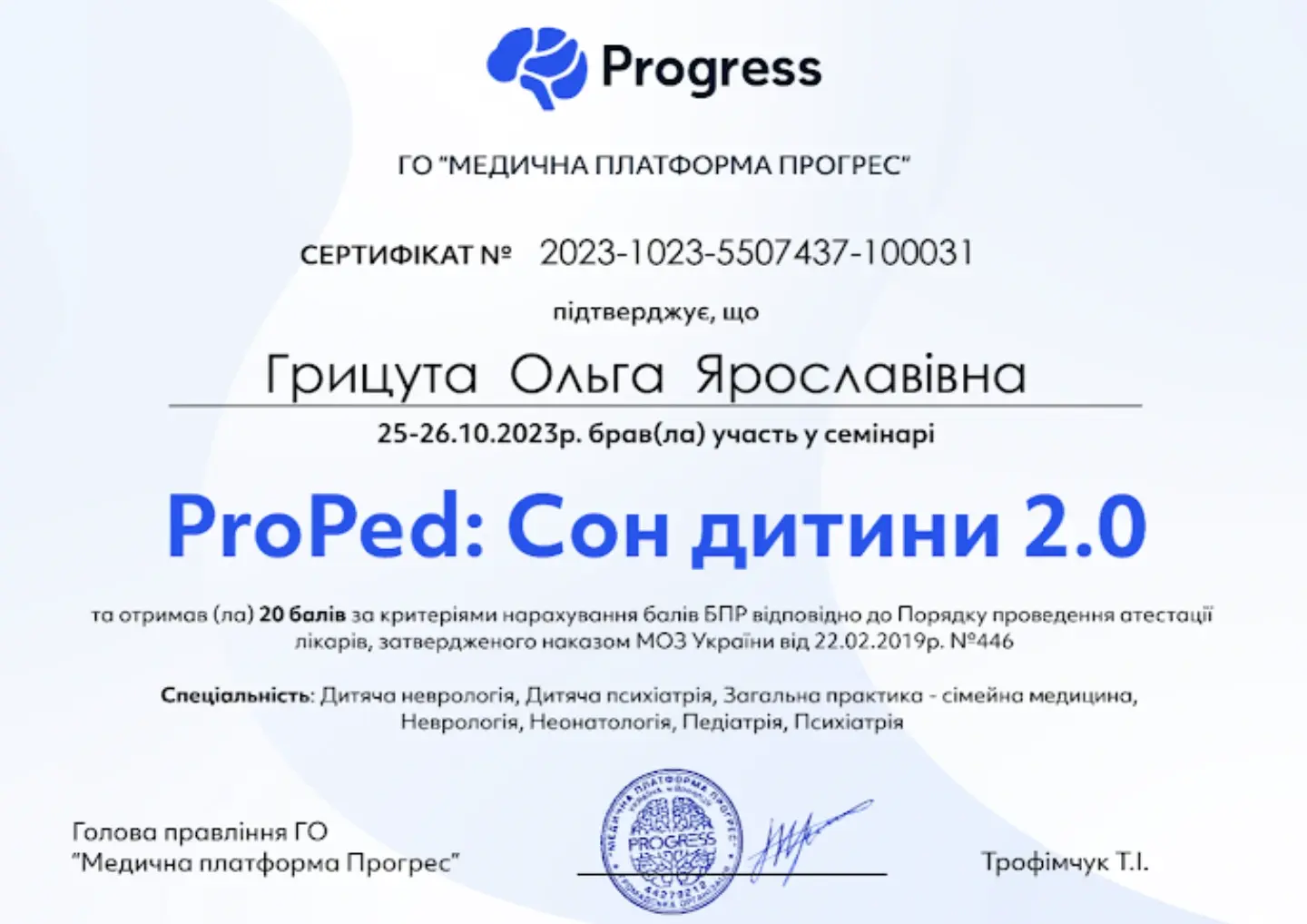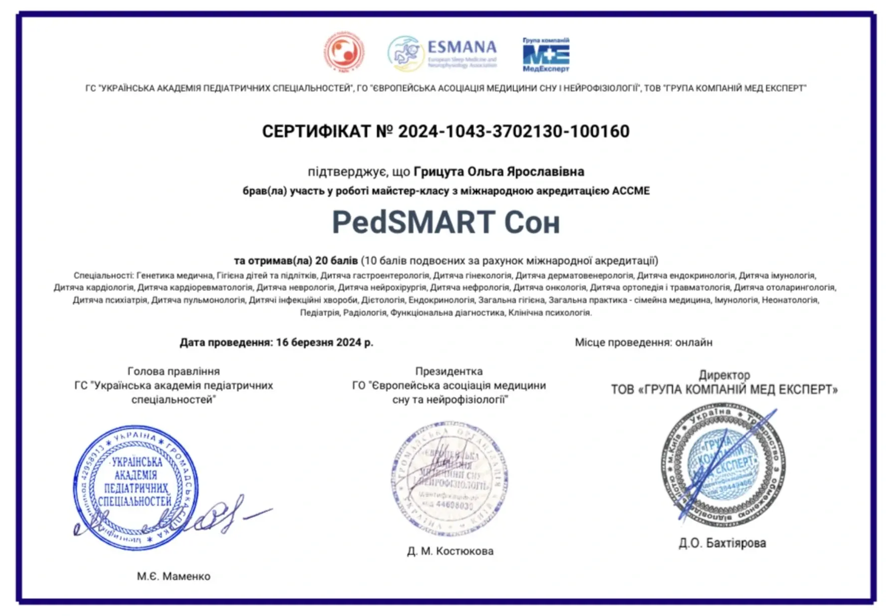 Регулярно відвідує заходи від навчальних платформ: Progress platform, Prime pediatrics, PedSMART, Esmana та багато інших.