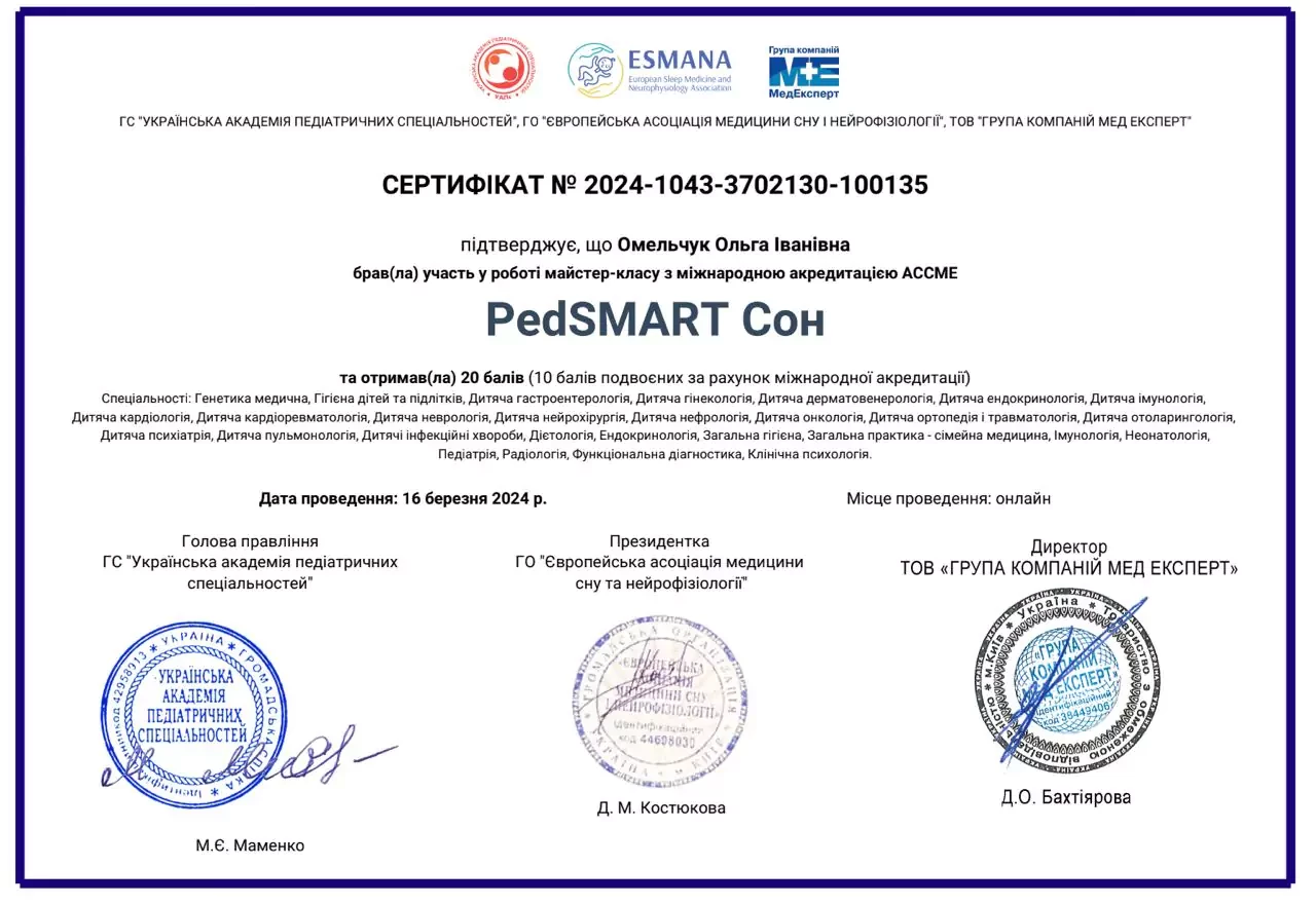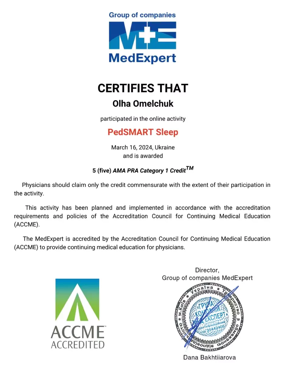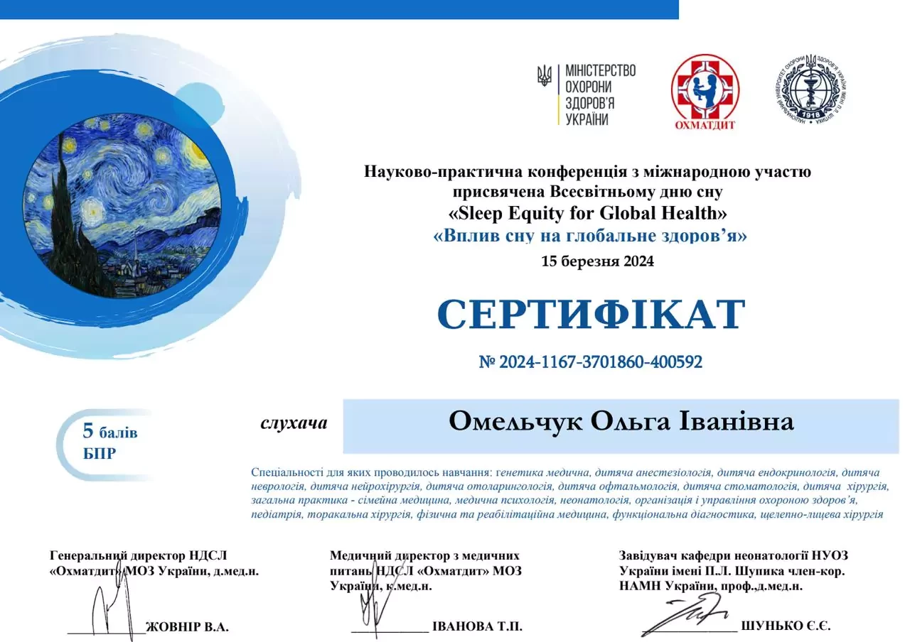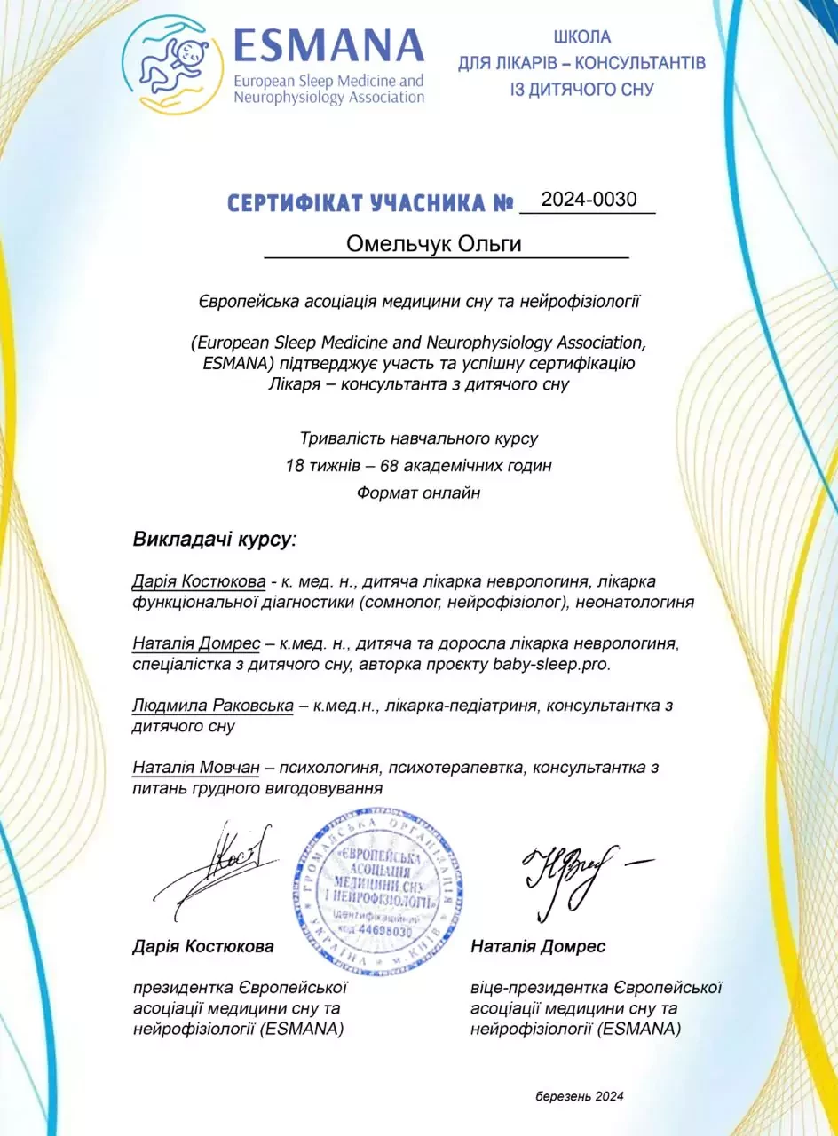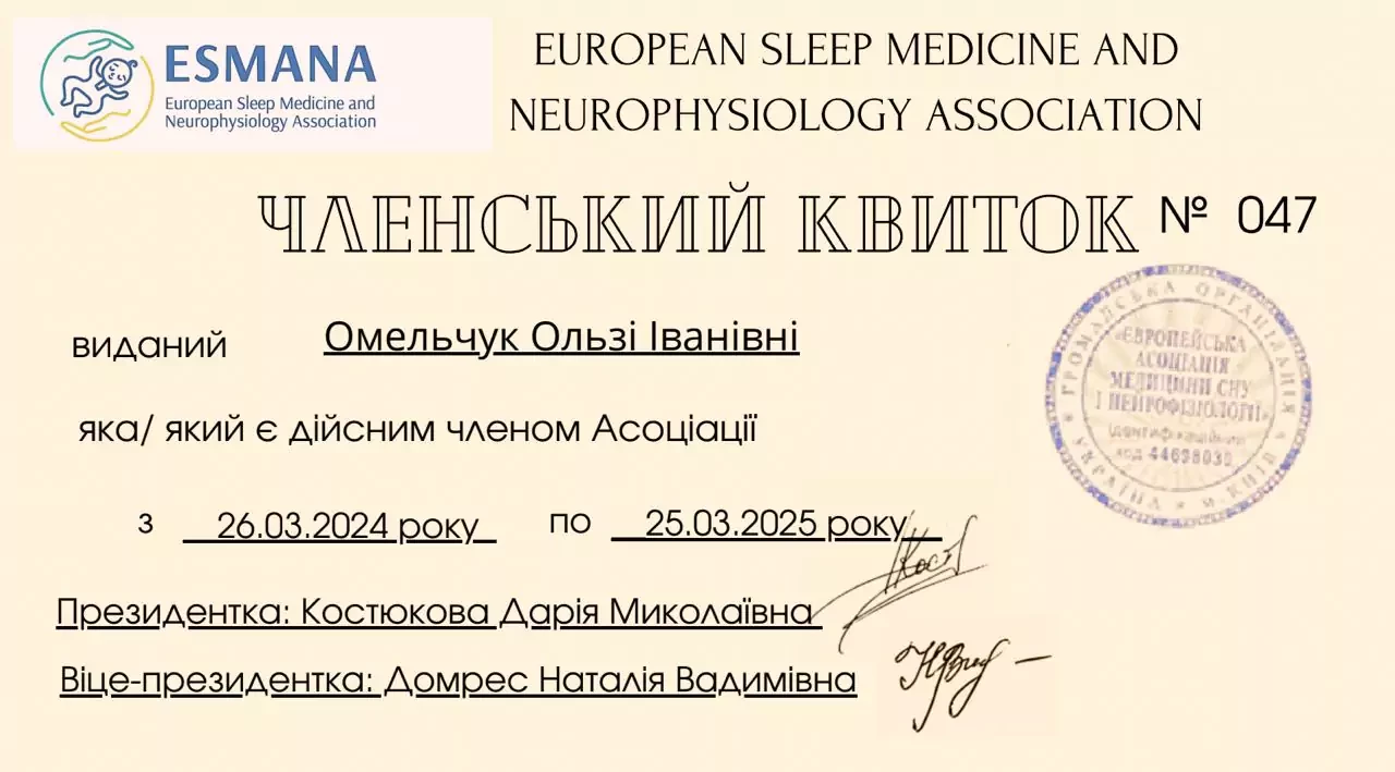- 2024 р - Випуск європейської асоціації медицини ESMANA, сертифікований консультант зі сну