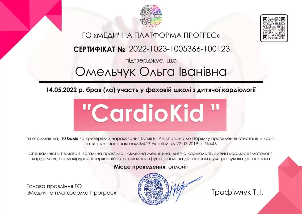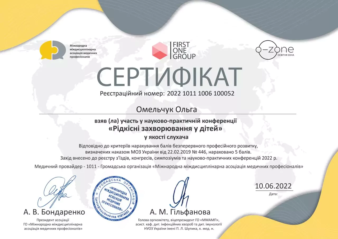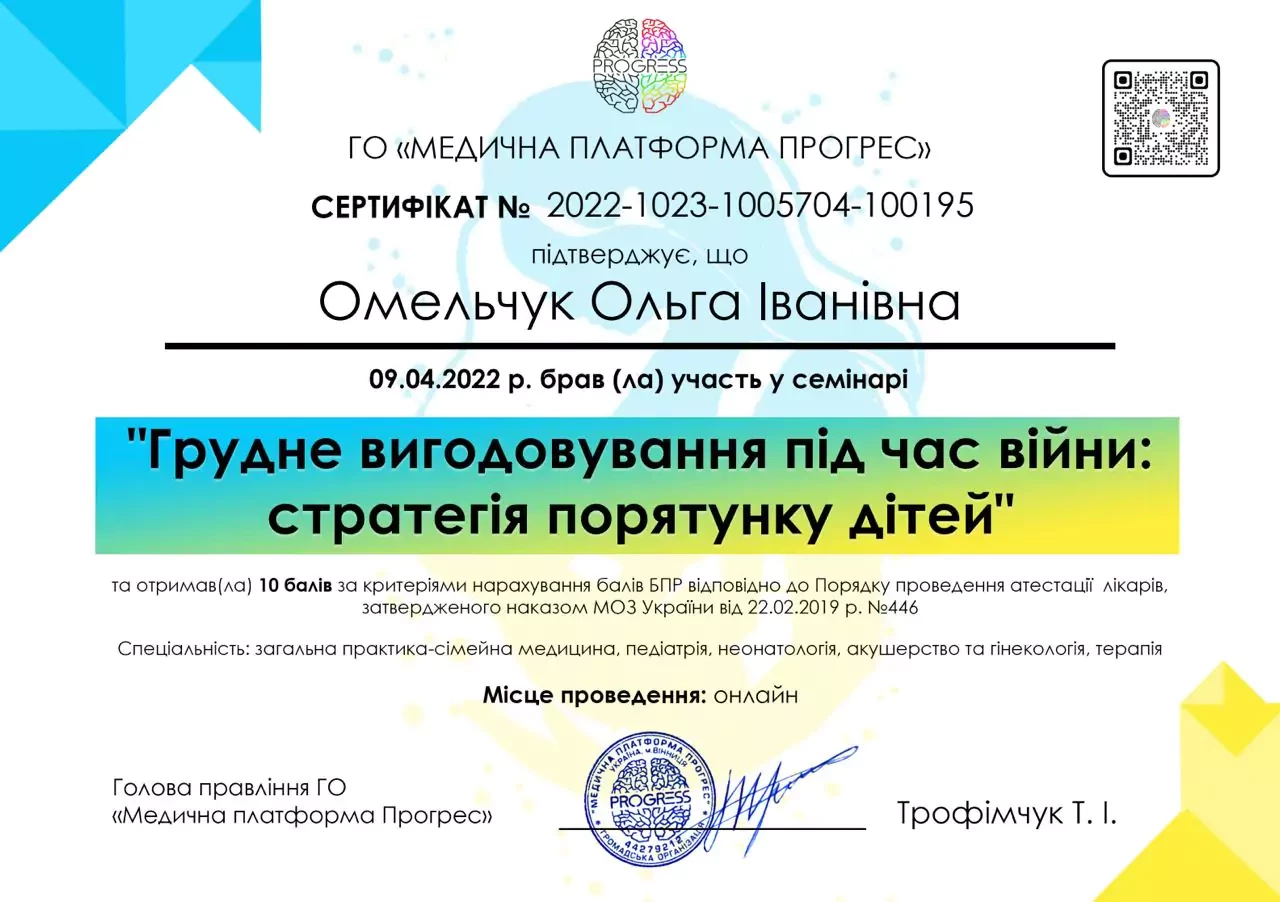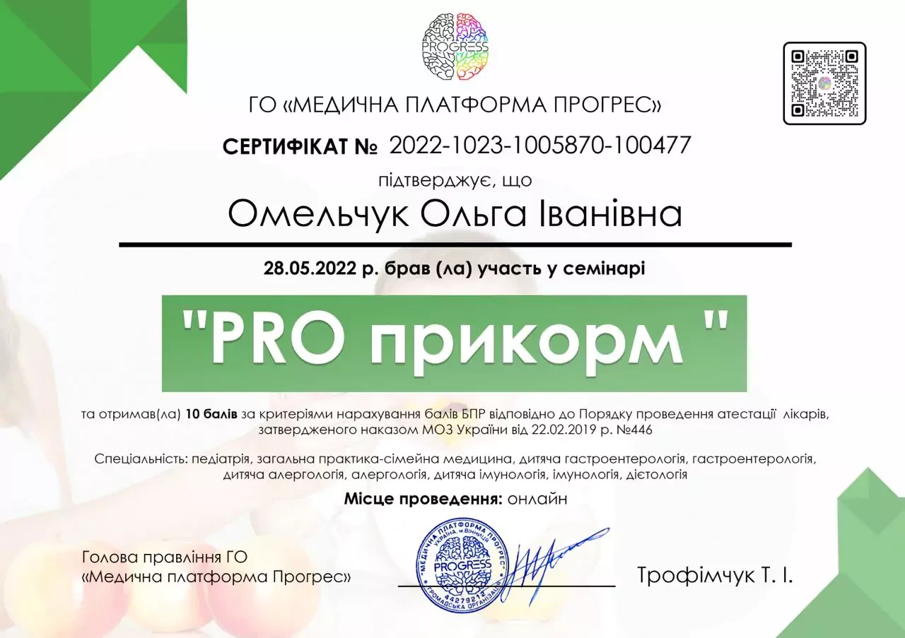- 2025 р. - Сертифікат лікаря-спеціаліста за спеціальністю "Дитяча алергологія" НУОЗУ ім. п. Л. Шупика