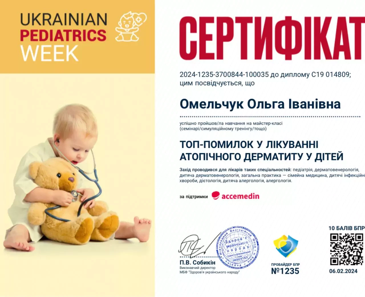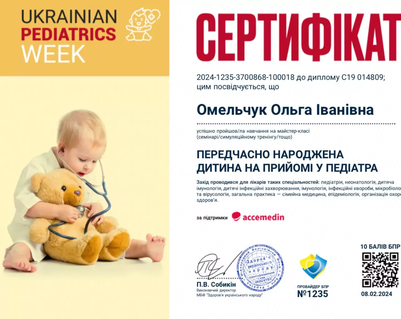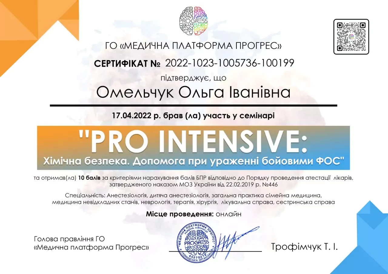 - 2025 р. - Сертифікат лікаря-спеціаліста за спеціальністю "Дитяча алергологія" НУОЗУ ім. п. Л. Шупика