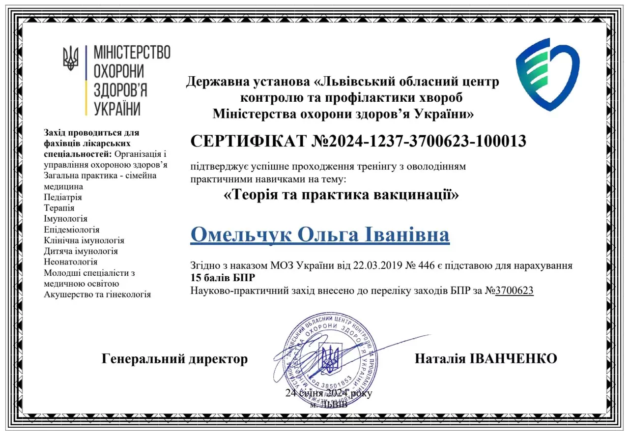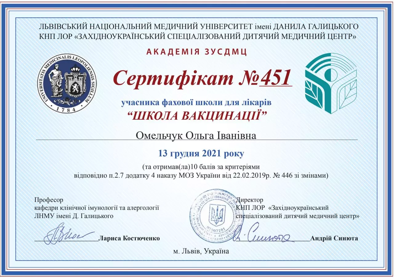 - 2019 р - Сертифікат лікаря-спеціаліста за спеціальністю "Педіатрія" ЛНМУ ім.Д.Галицького