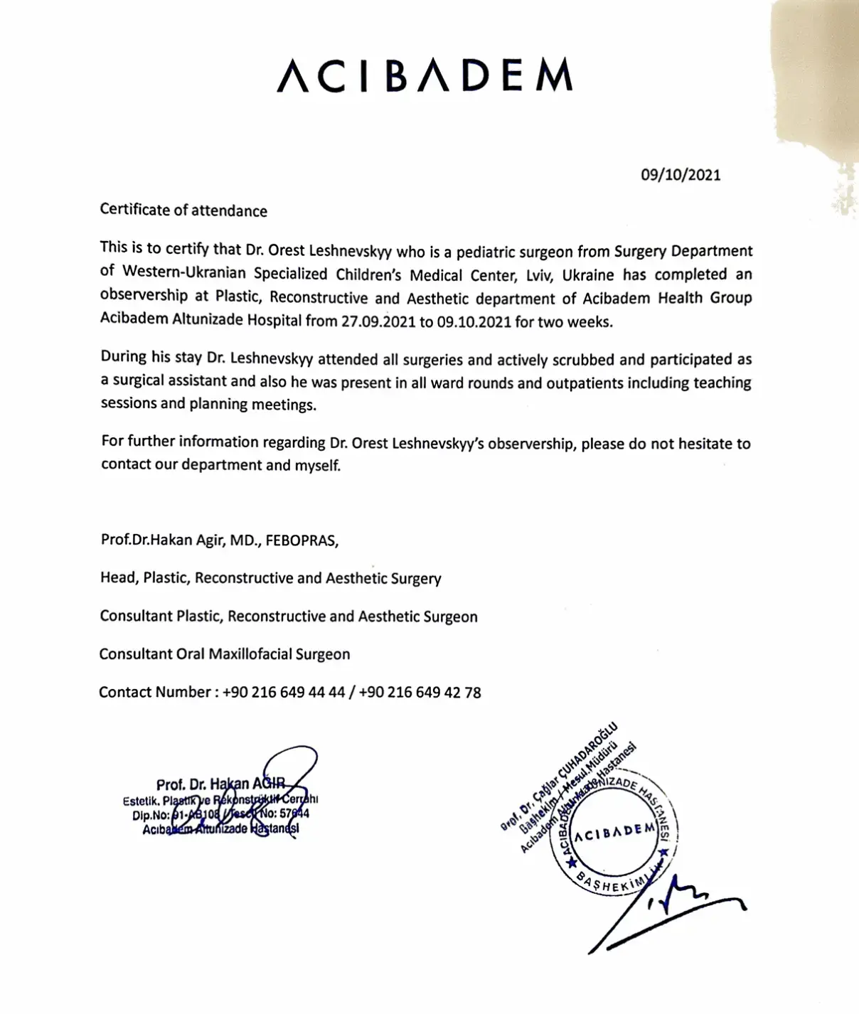 - 2021, 2023 – стажування в Госпіталі Аджібадем Альтунізаде, Стамбул (Туреччина) у Відділенні Пластичної, Реконструктивної та Естетичної Хірургії.