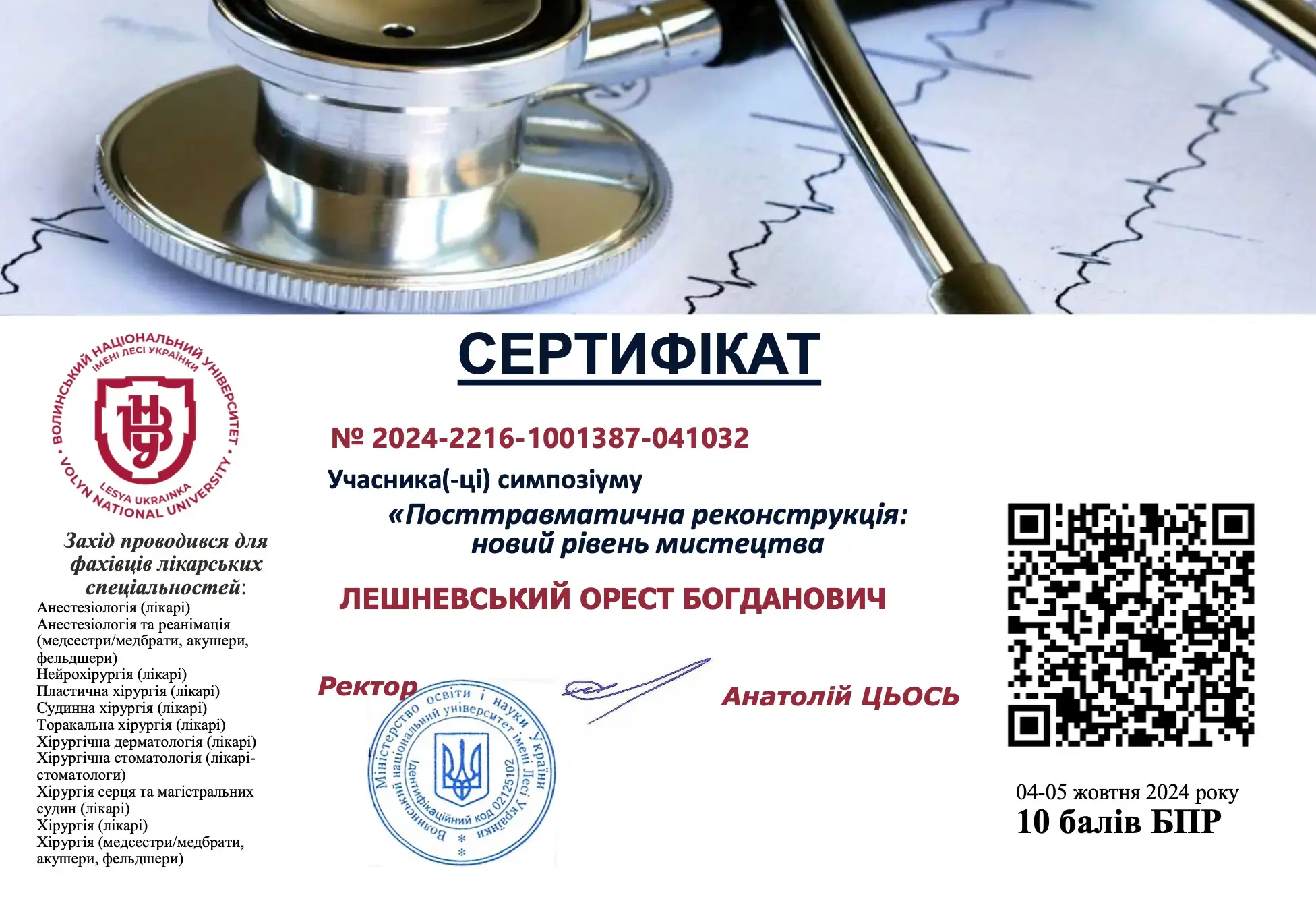 - 2024 – спеціалізація «Пластична хірургія».