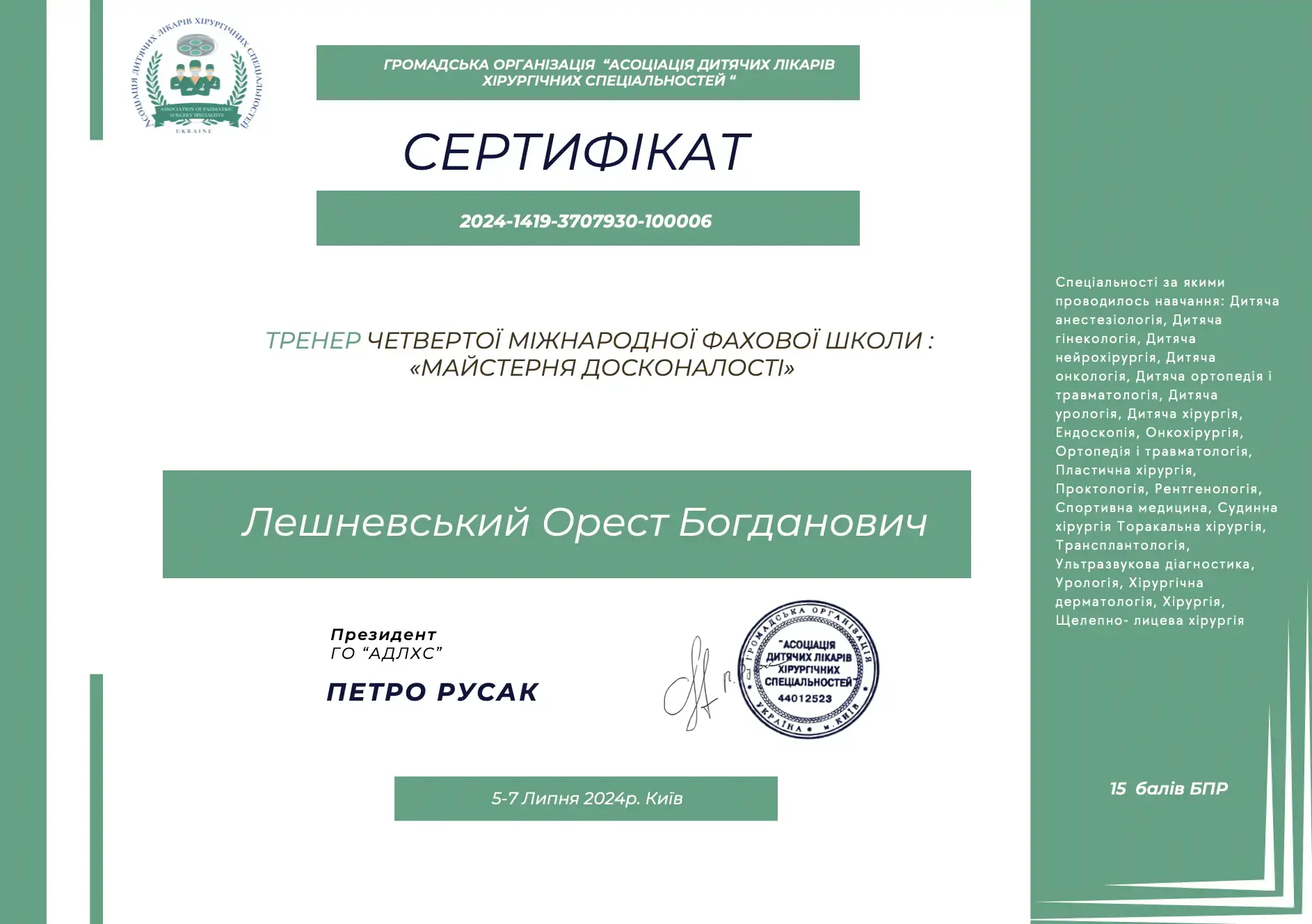 - 2020 – спеціалізація «Загальна хірургія».