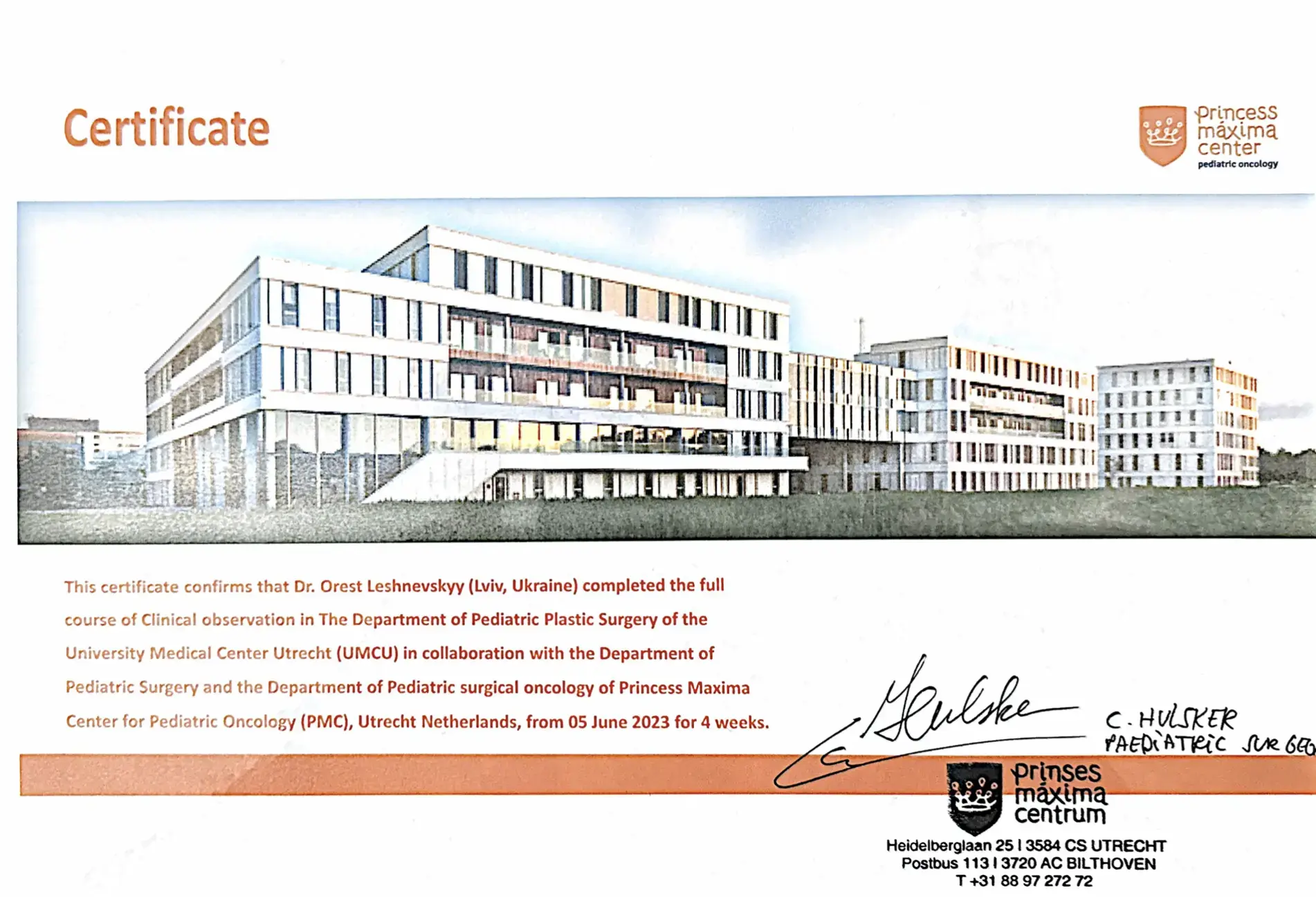 - 2023 рік – закінчив повний курс клінічного спостереження у Відділенні Дитячої Онкологічної Клініки Принцеси Максими м. Утрехт (Нідерланди).