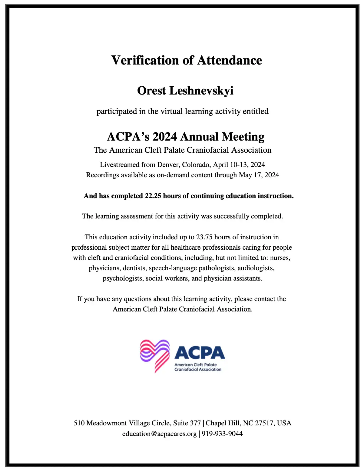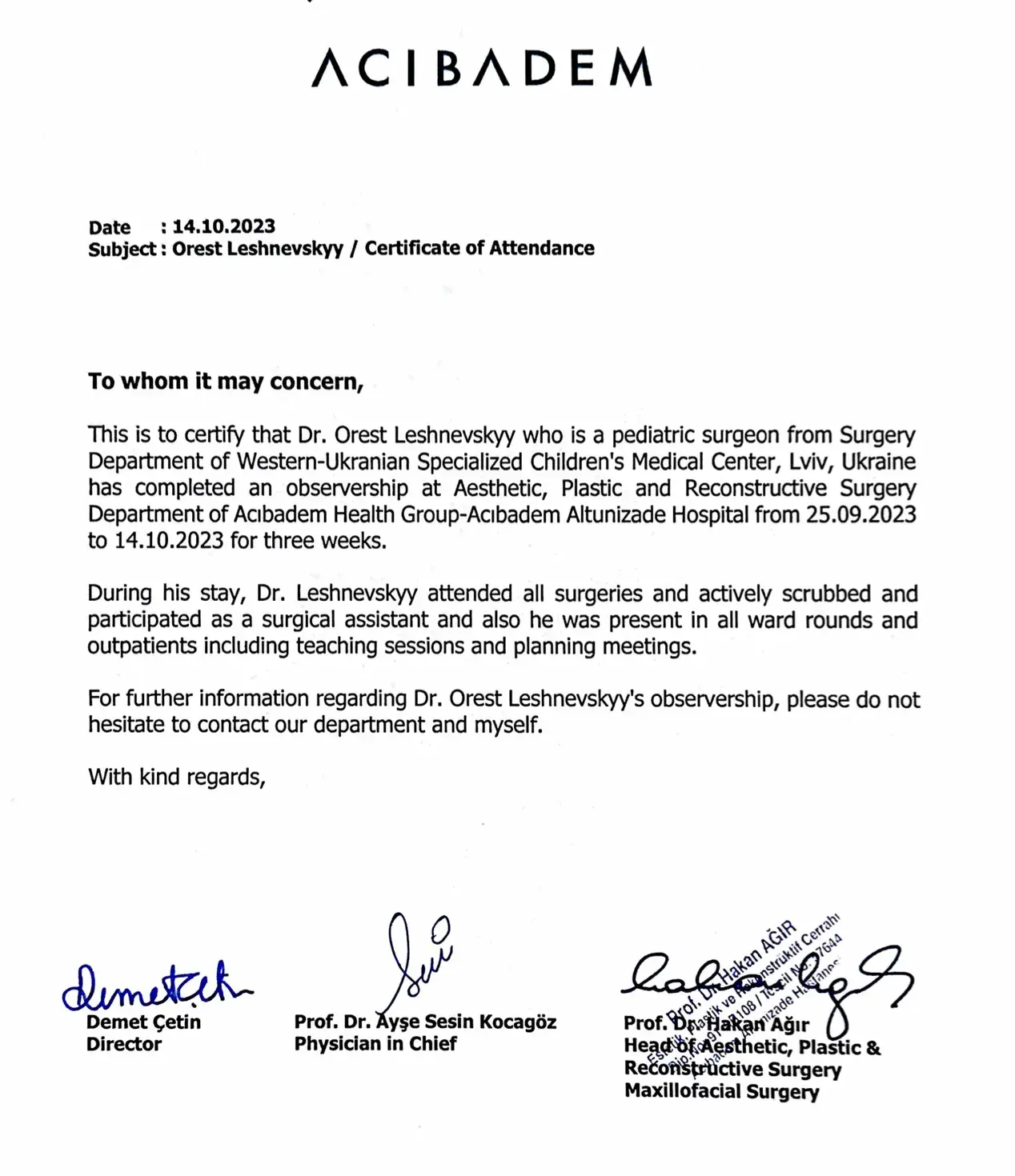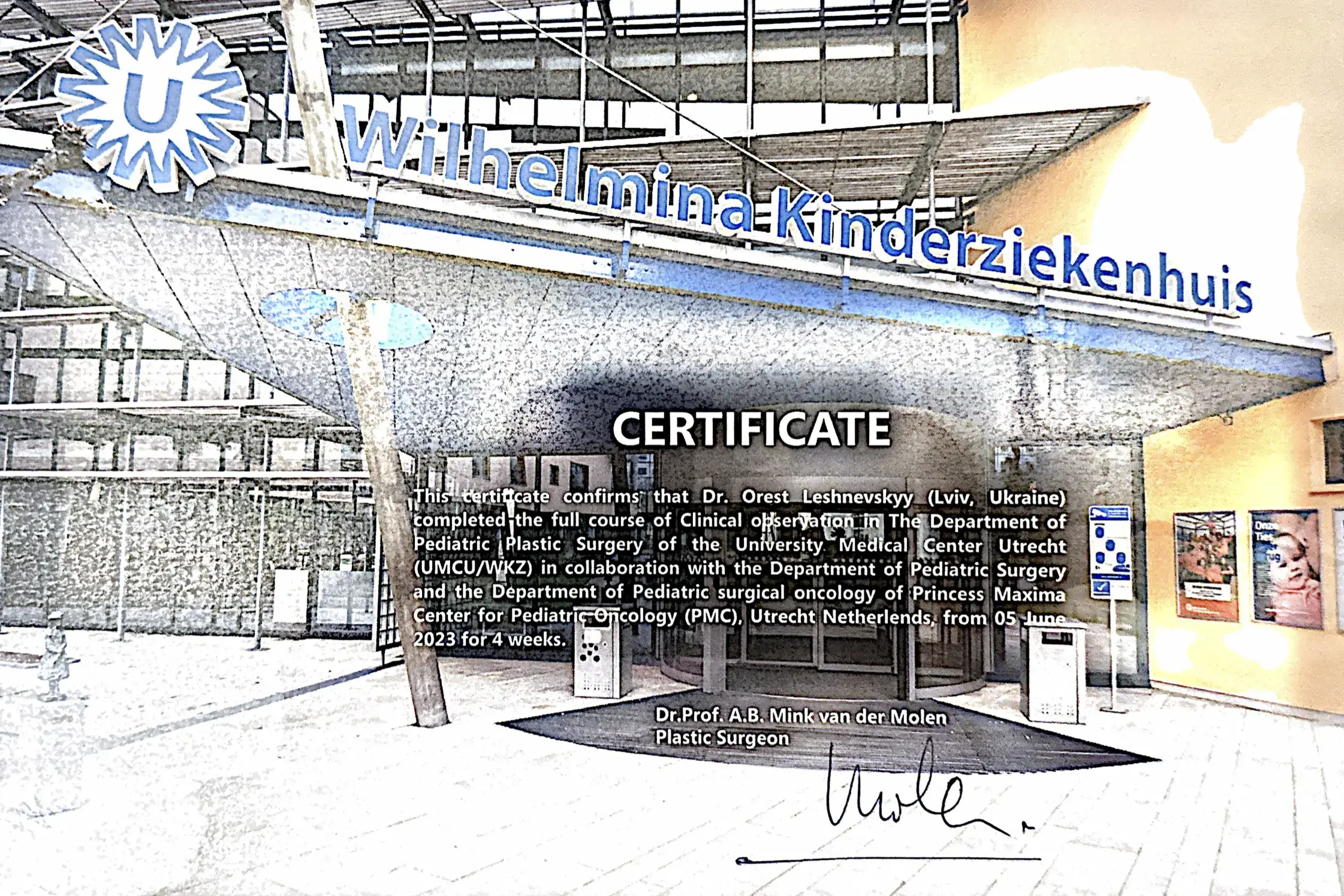 - 2023 рік – закінчив повний курс клінічного спостереження у Відділенні Дитячої Пластичної Хірургії Університетського Медичного Центру Утрехта (Нідерланди).
