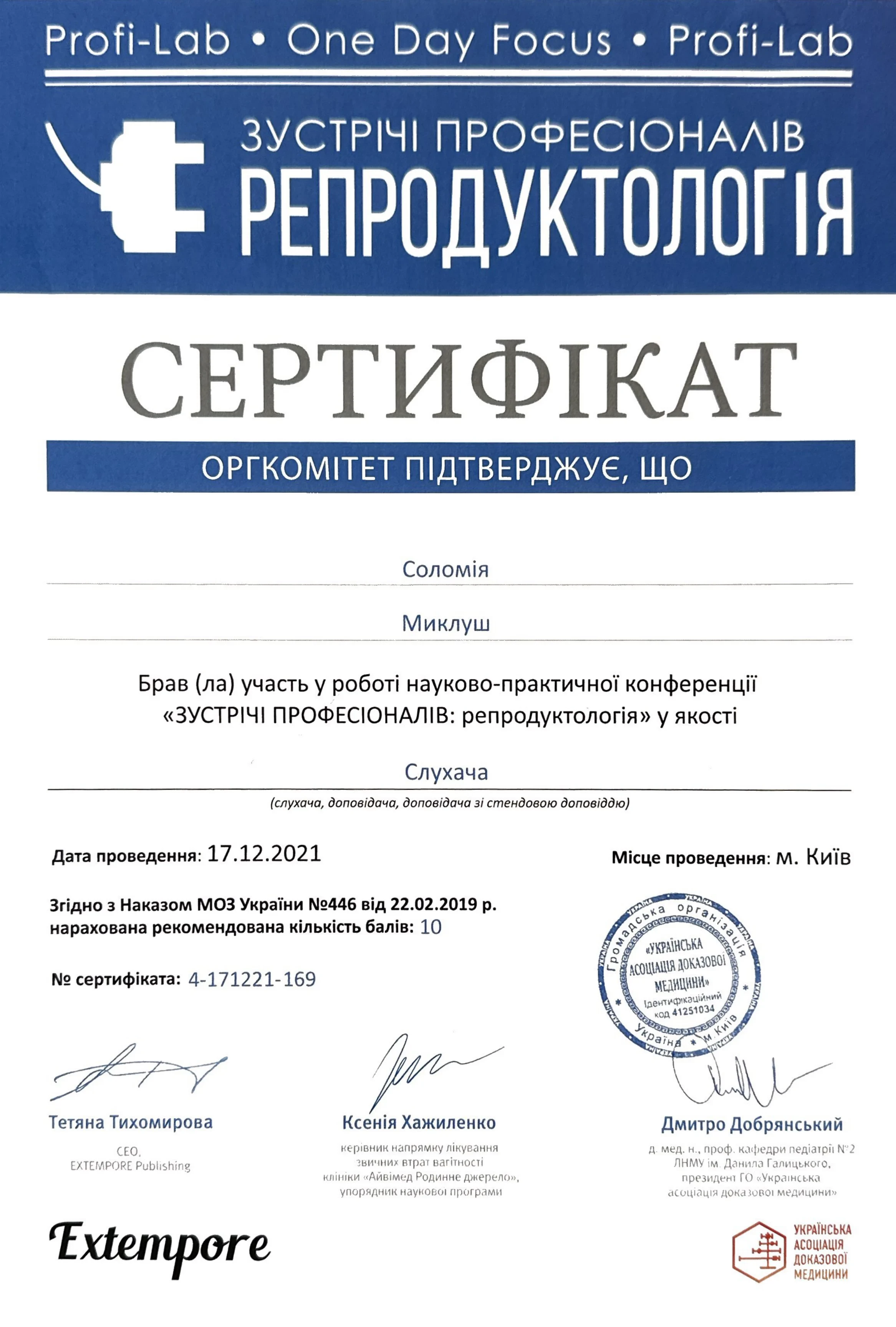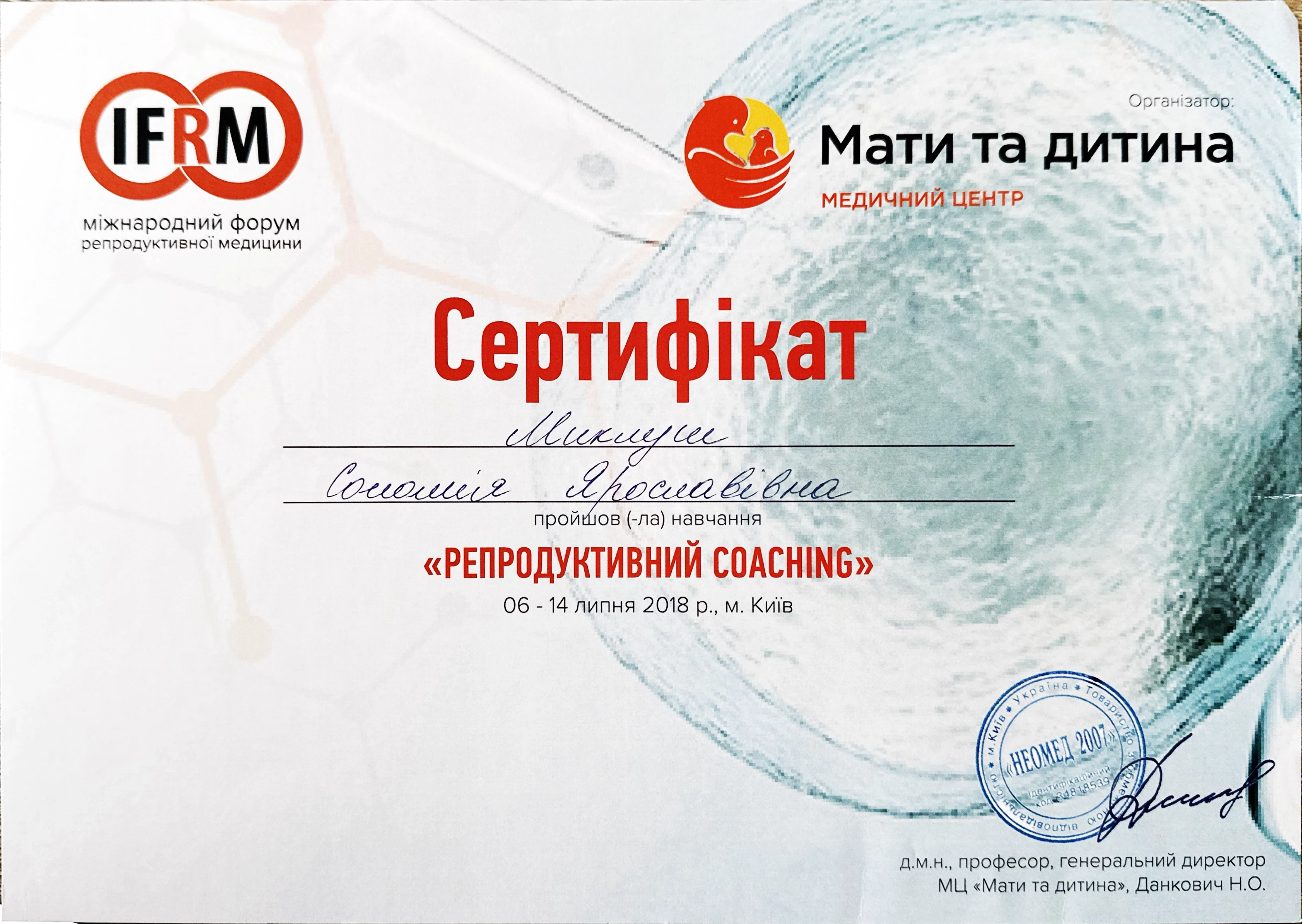 - 2017 - Школа репродуктології МЦ “Інтерсоно”, Львів 2018 - Основи репродуктології МЦ "Мати та дитина", Київ