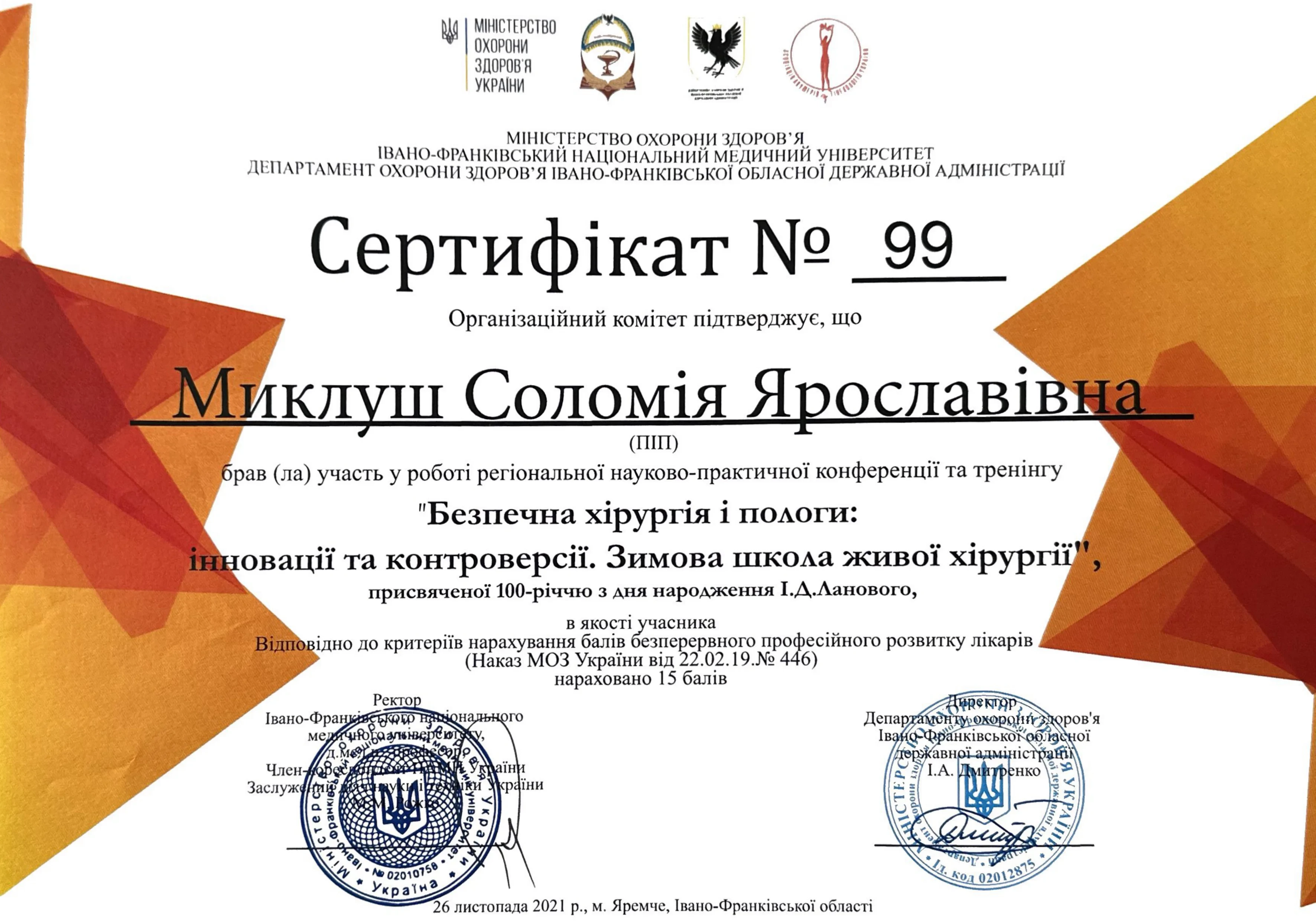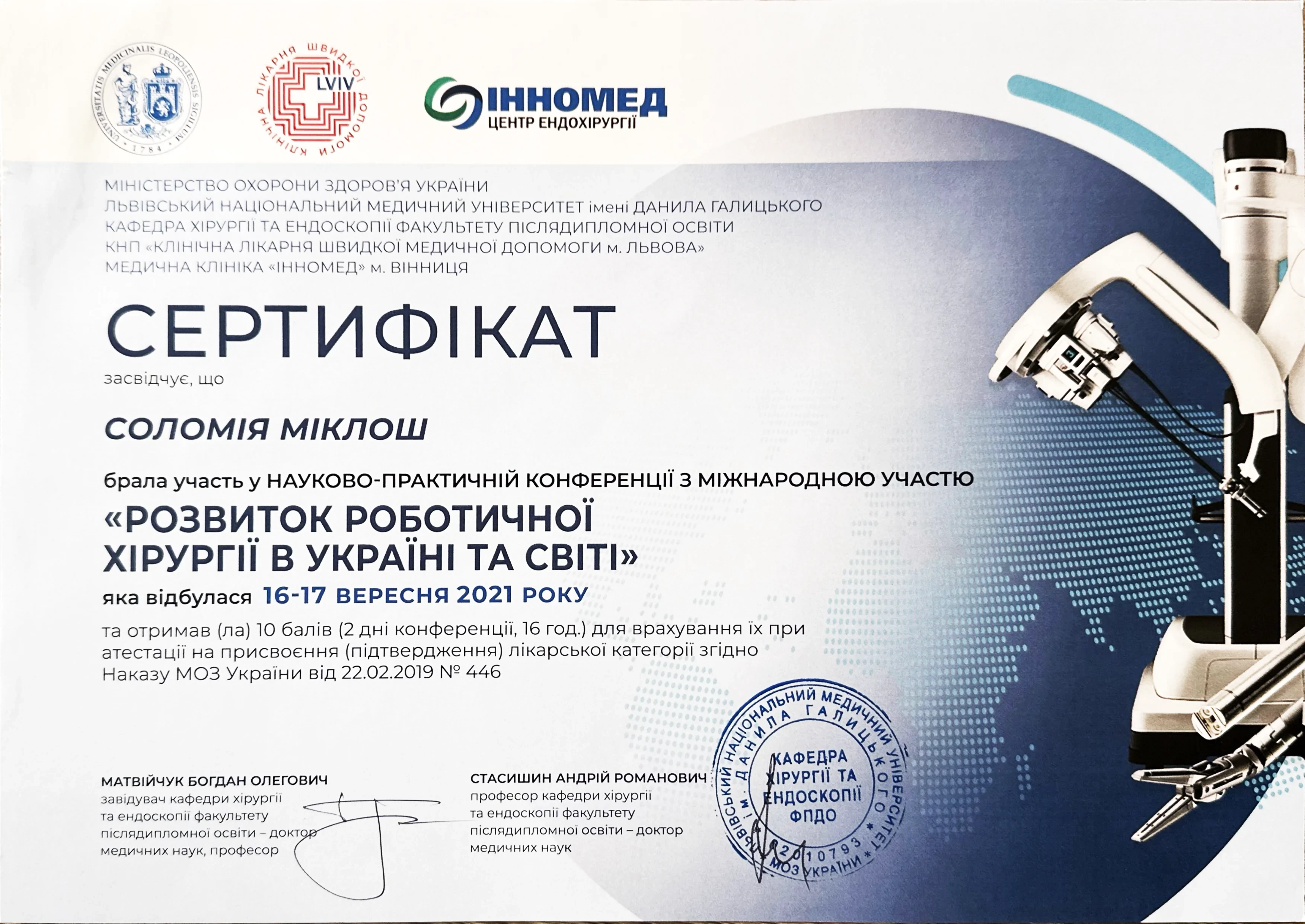 - 2021 - ТУ «Гістероскопія для акушер-гінекологів», Міністерство охорони здоров'я України, ЛНМУ імені Данила Галицького