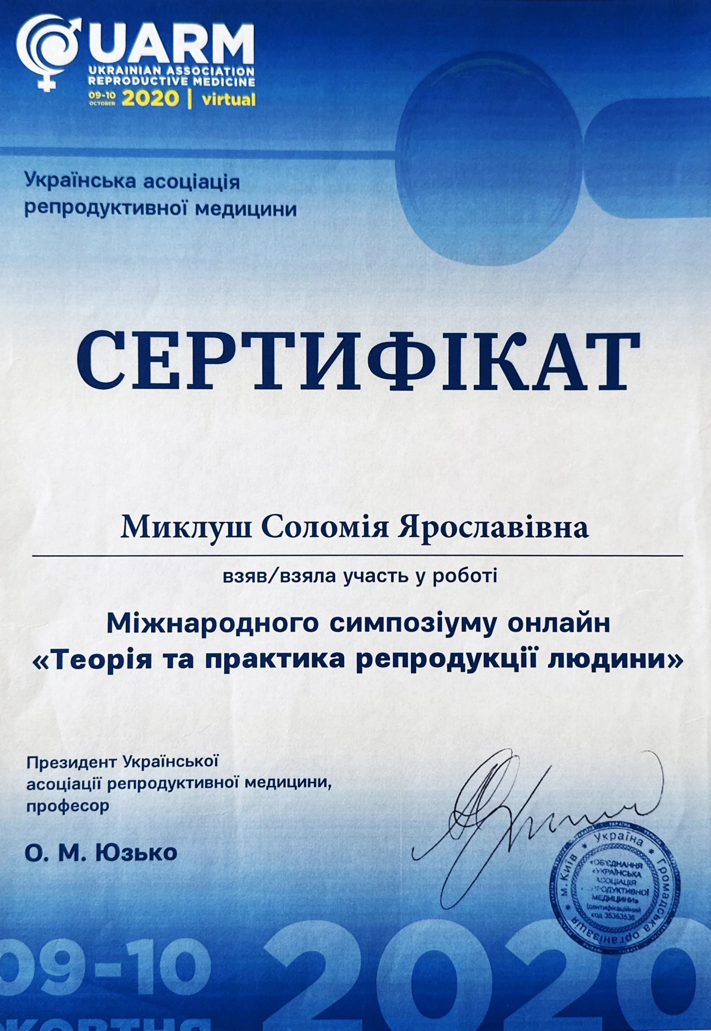 - 2019 - Кольпоскопія в діагностиці норми і патології шийки матки, Львів 2020 - Міжнародний симпозіум "Теорія та практика репродукції людини", Київ
