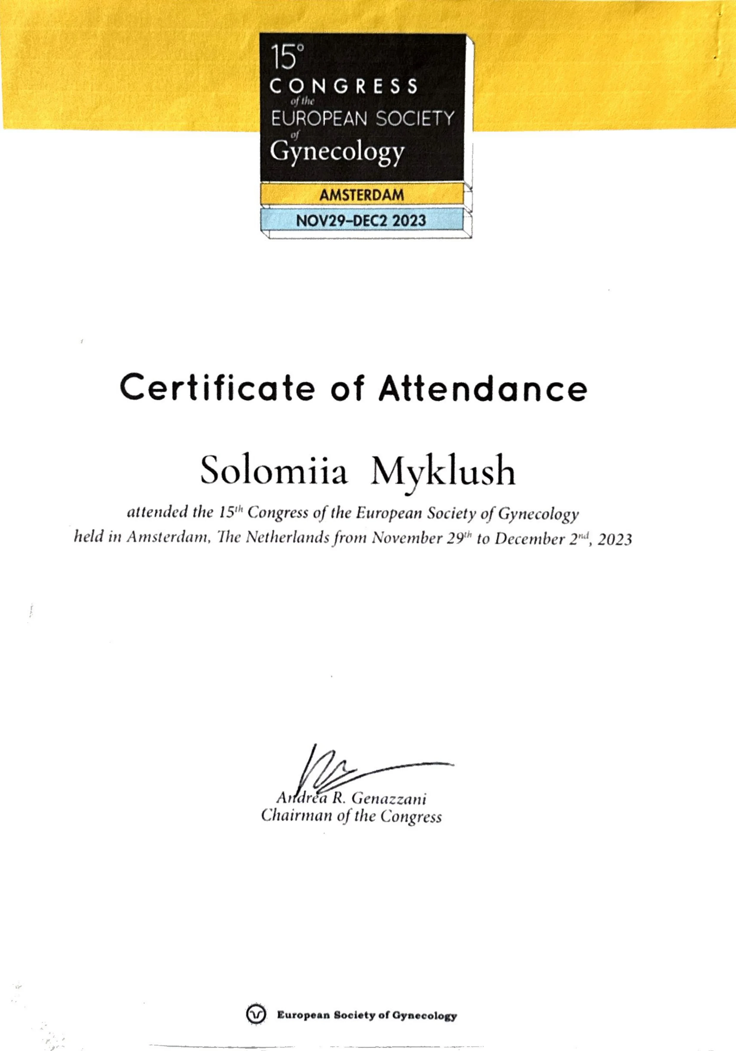 - 2023 - учасниця 15го Конгресу Європейської асоціації гінекології, Амстердам, Нідерланди