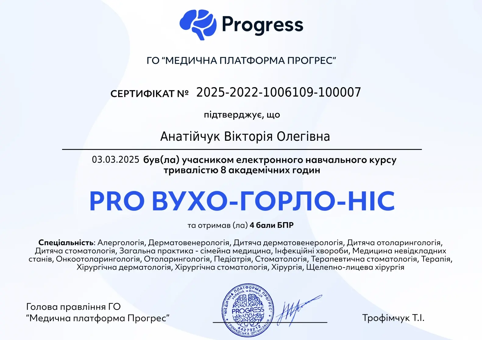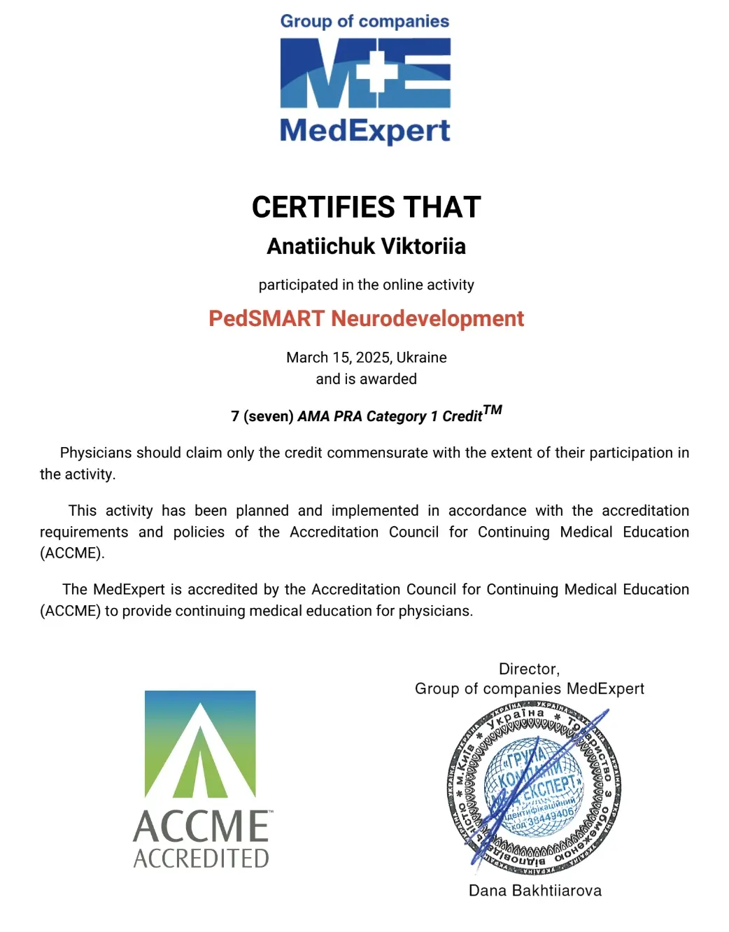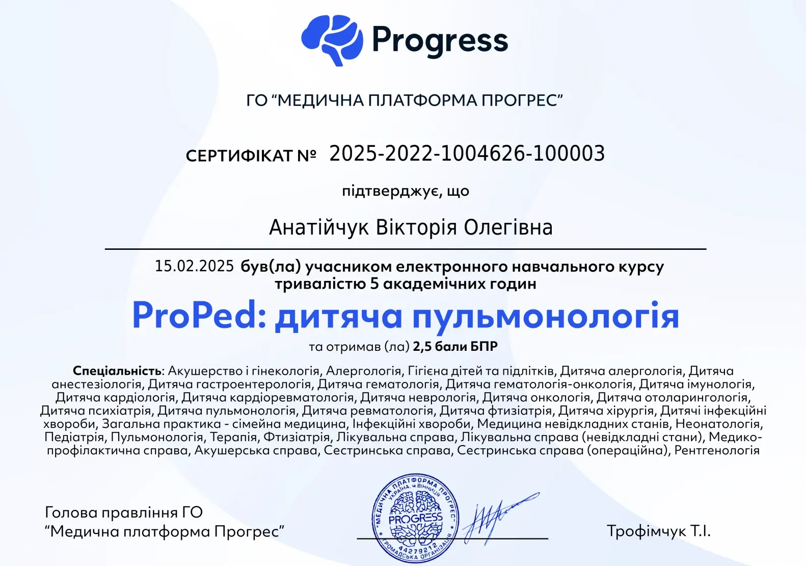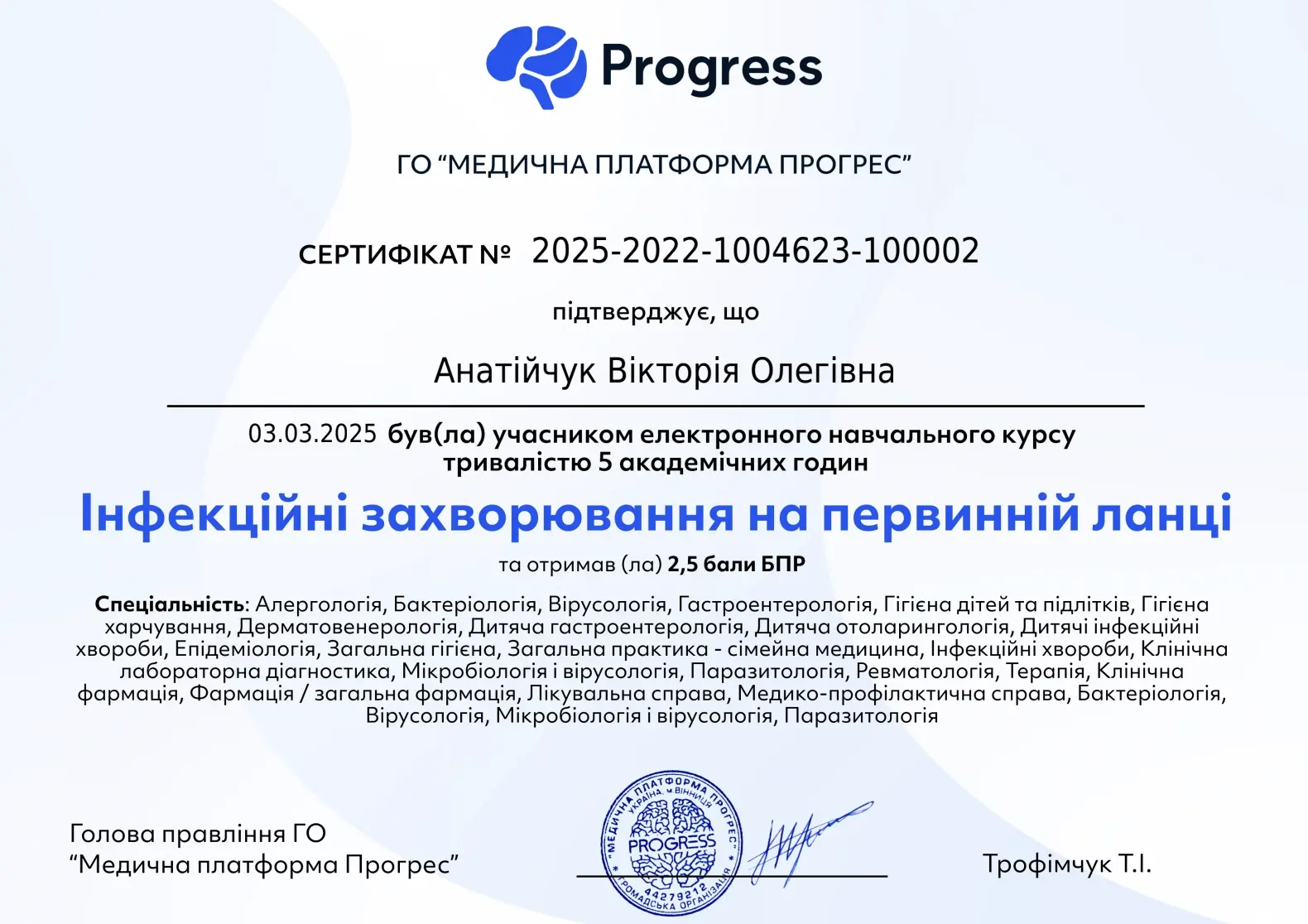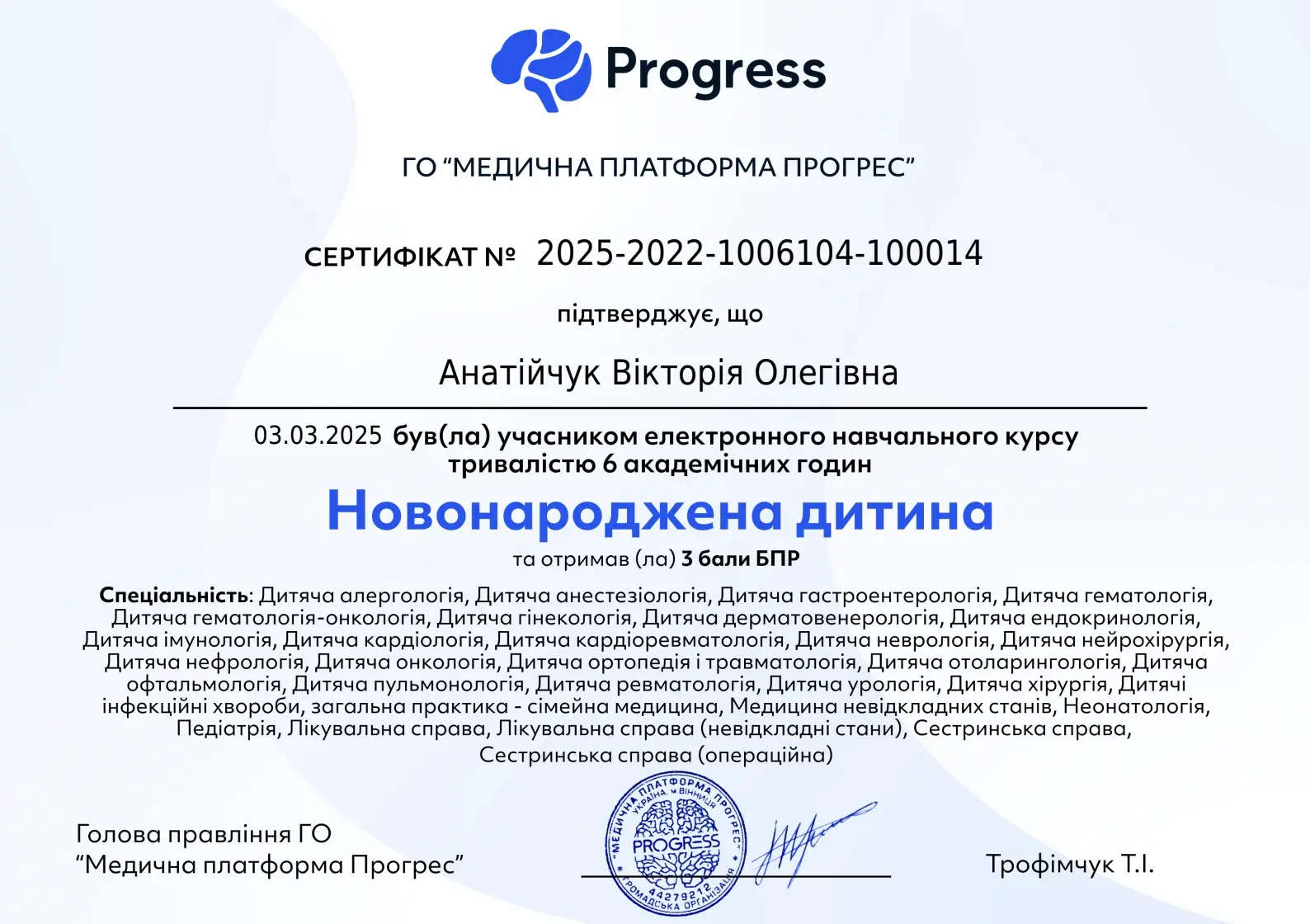 Анатійчук Вікторія Олегівна - лікарка-педіатр медичного центру Медіальт. Працює з дітьми від народження і до 18 років, займається як профілактичними оглядами, вакцинацією, так і лікуванням гострих чи хронічних станів. Практикує доказову медицину, використовуючи сучасні протоколи лікування та постійно оновлює свої знання на конференціях від колег зі всього світу.