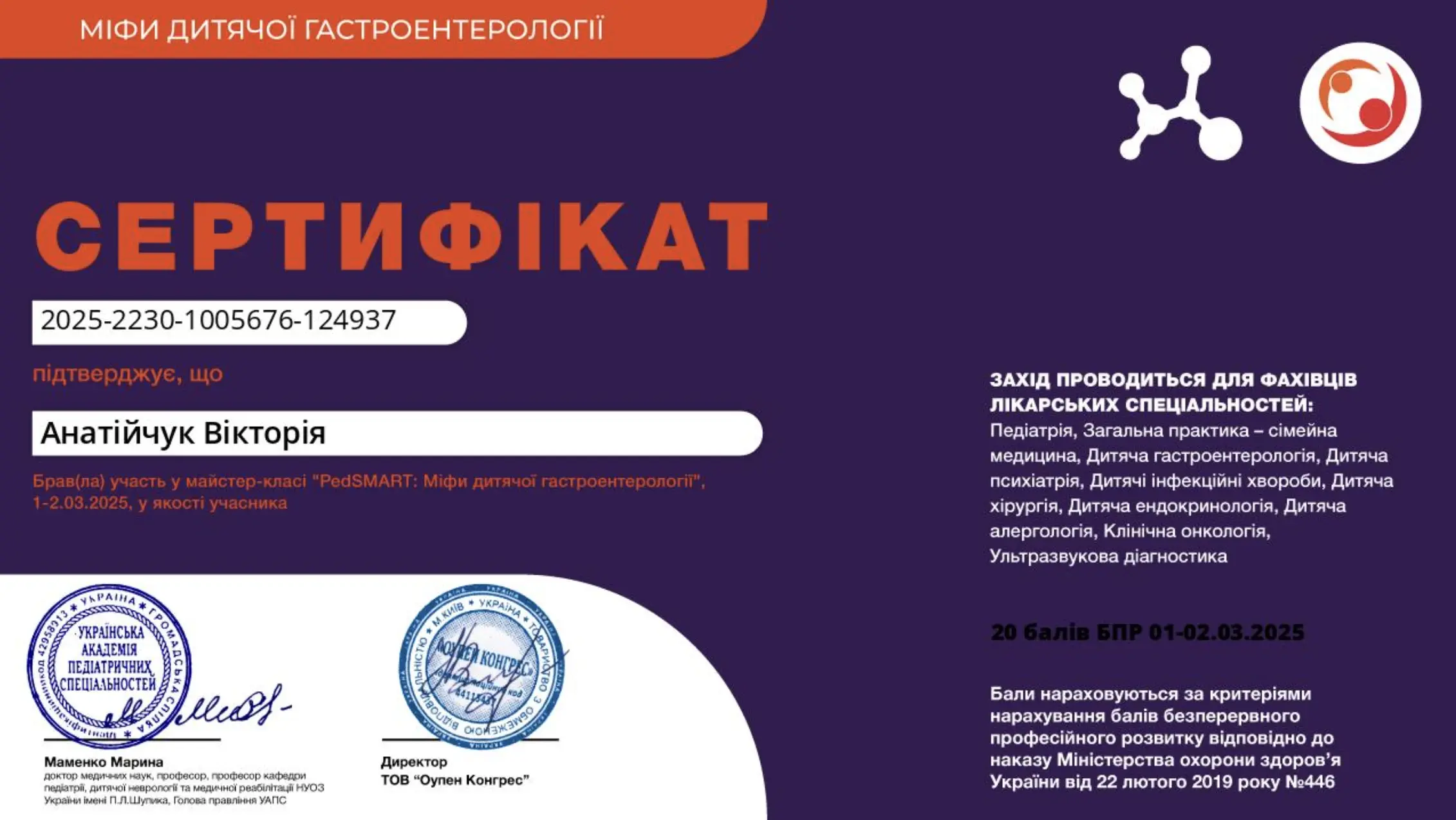 - 2020 - Інтернатура на базі Західноукраїнського спеціалізованого дитячого медичного центру у відділенні педіатрії.